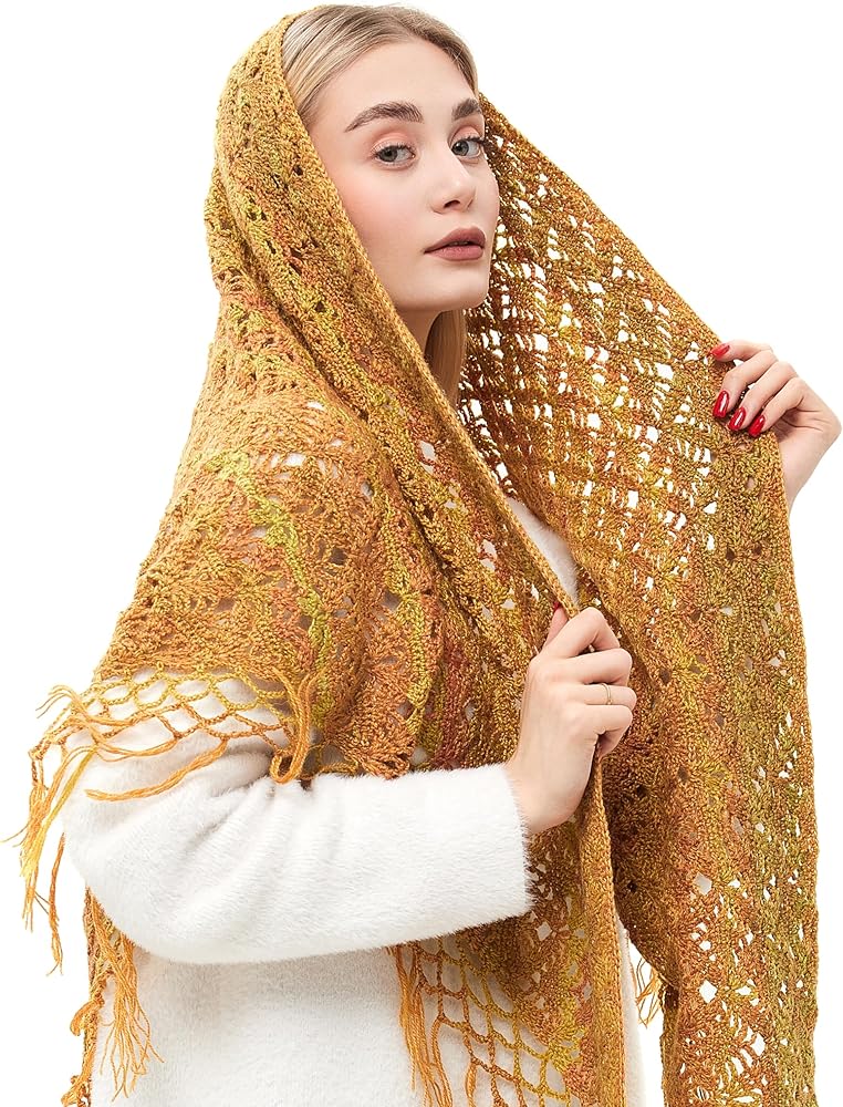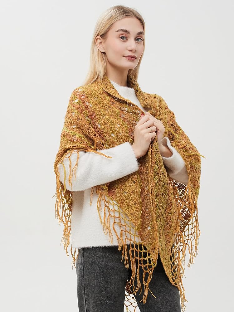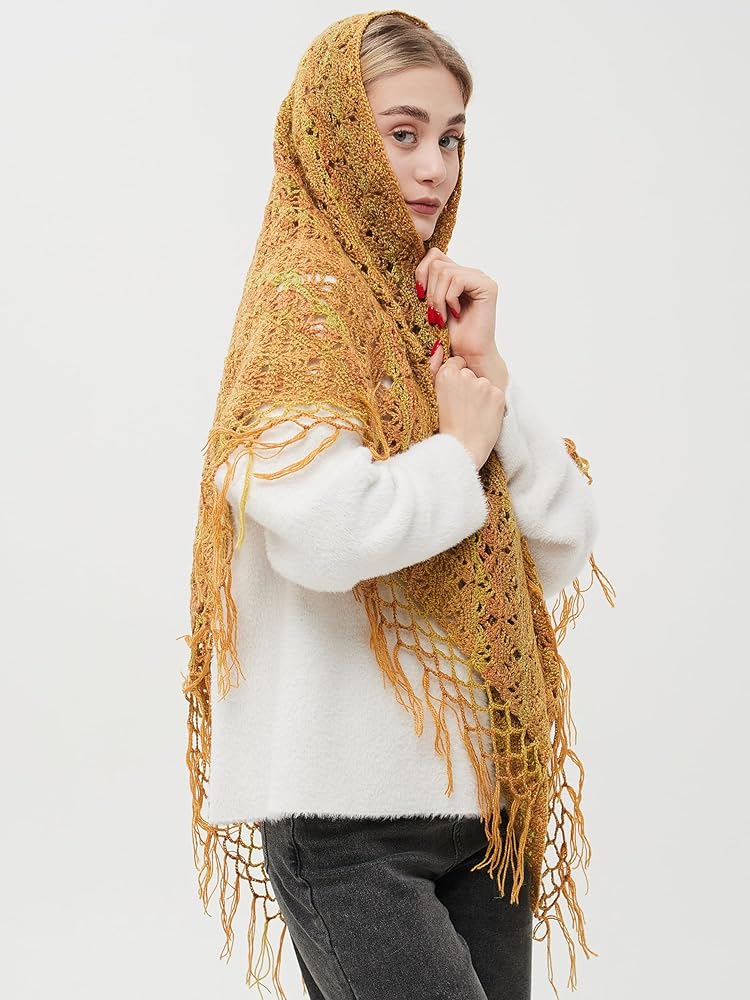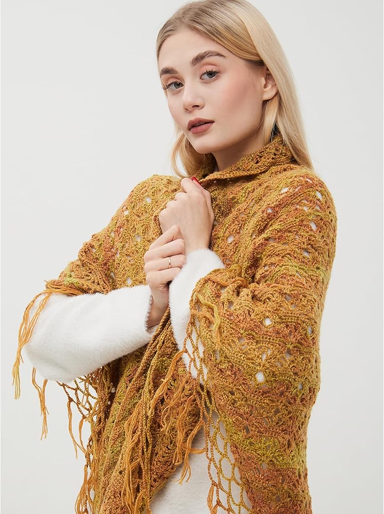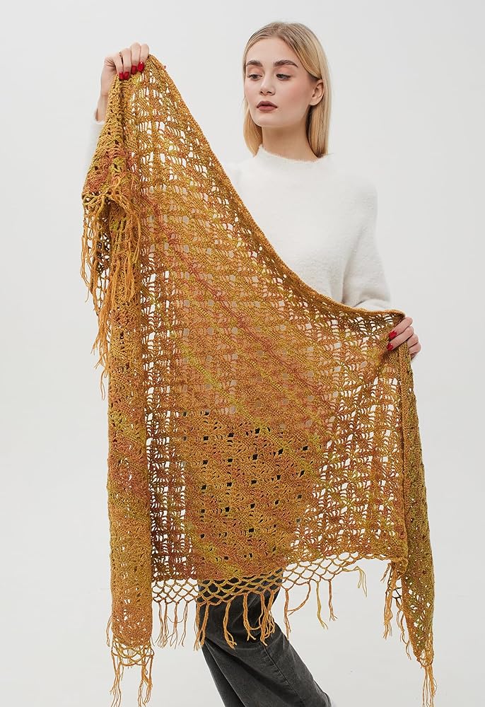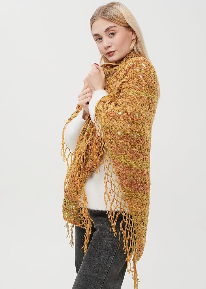 وشاح ملفوف مثلث مكتنز مع شرابات، شال صوف كروشيه، وشاح مكتنز، وشاح هامشي، شال ملفوف متماسك الخردل.