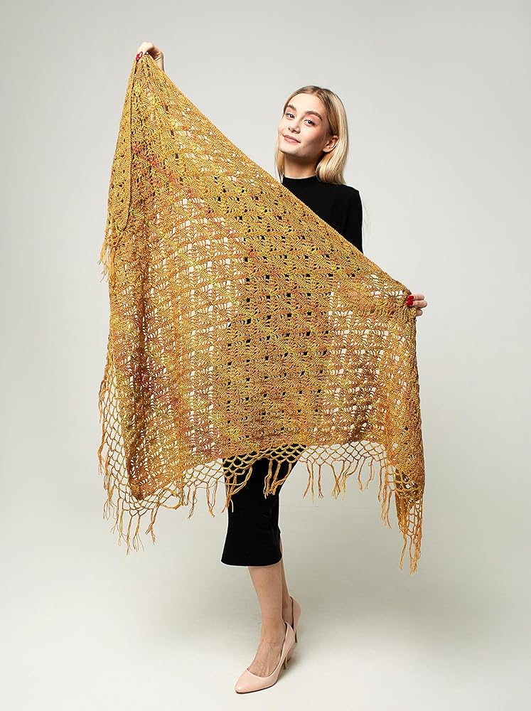 A wool shawl crocheted in mustard color.