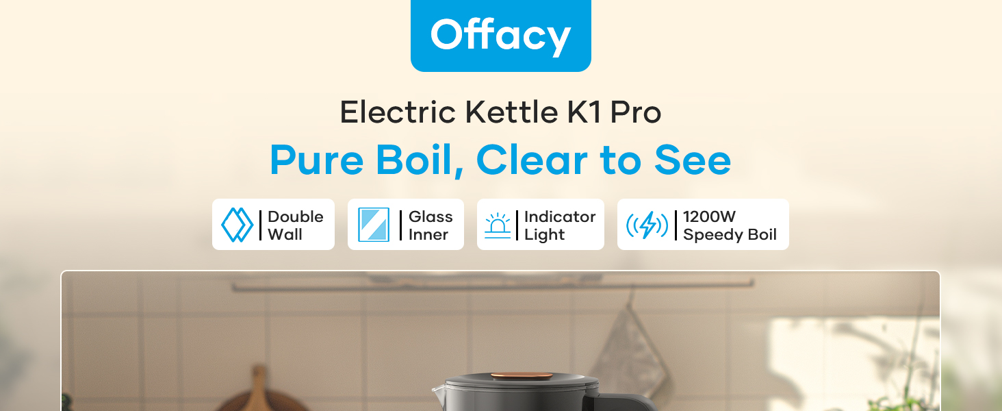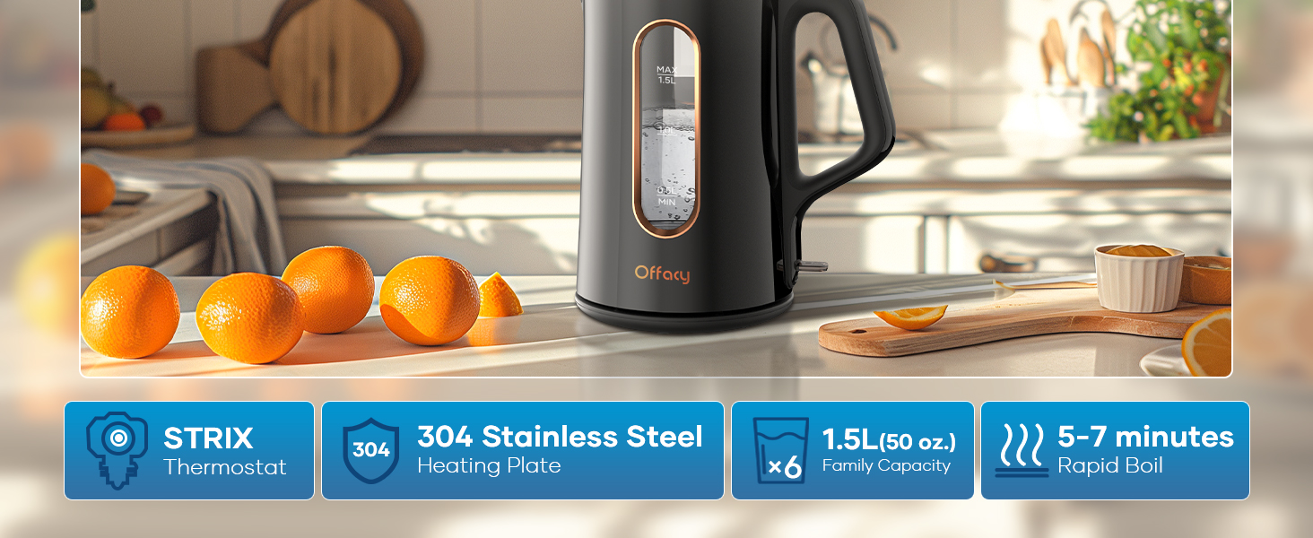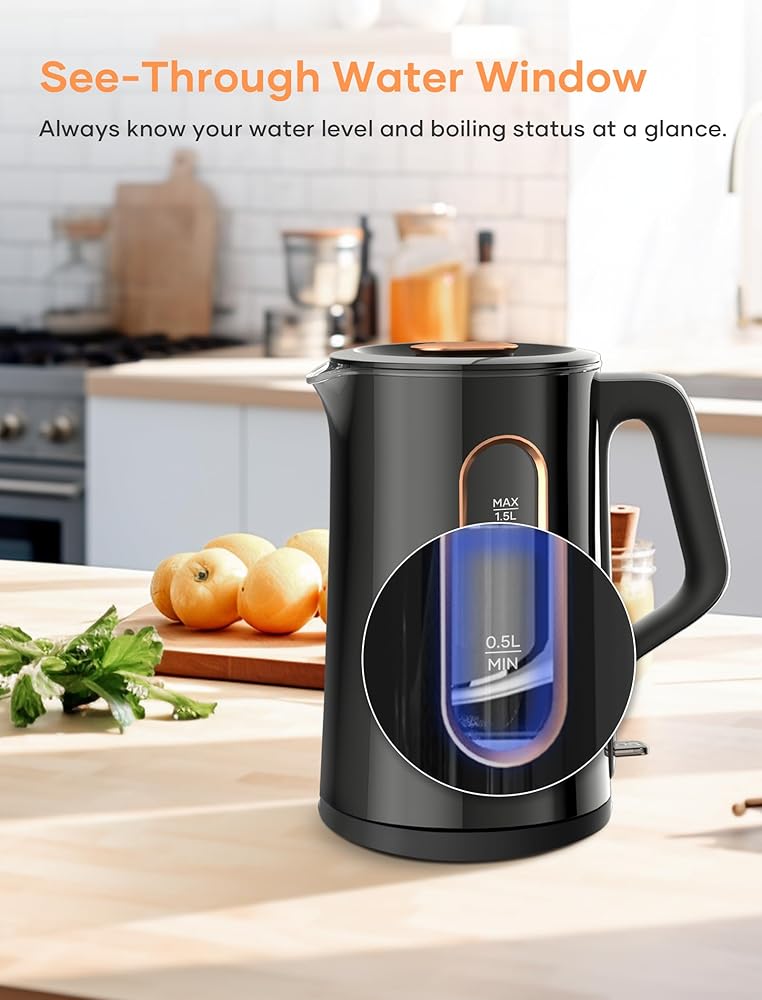 تسخين سريع: مجهزة بلوحة تسخين قوية بقدرة 1200 واط، تقوم غلايتنا بغلي الماء في 5 دقائق فقط. يتحول ضوء المؤشر المريح إلى اللون الأزرق عندما يغلي الماء وينطفئ تلقائيًا بمجرد اكتمال الغليان، مما يجعله مثاليًا لإعداد الشاي والقهوة ودقيق الشوفان والوجبات الفورية.