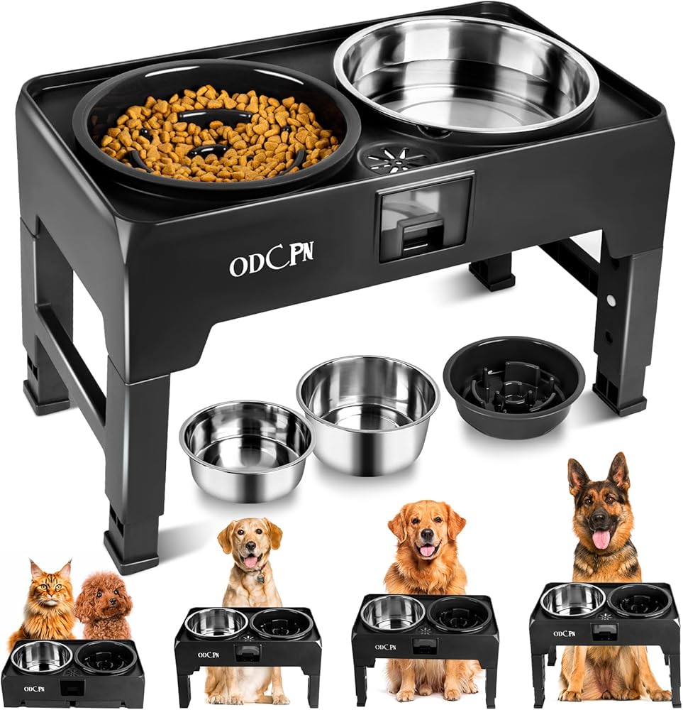 أوعية مرتفعة للكلاب ذات تغذية بطيئة، 6 أوعية للكلاب مرتفعة قابلة للتعديل مع 2 من الفولاذ المقاوم للصدأ و1 أوعية طعام للكلاب ذات تغذية بطيئة، حامل طعام للكلاب غير قابل للانزلاق مع تصميم درج تجميع للكلاب المتوسطة الكبيرة