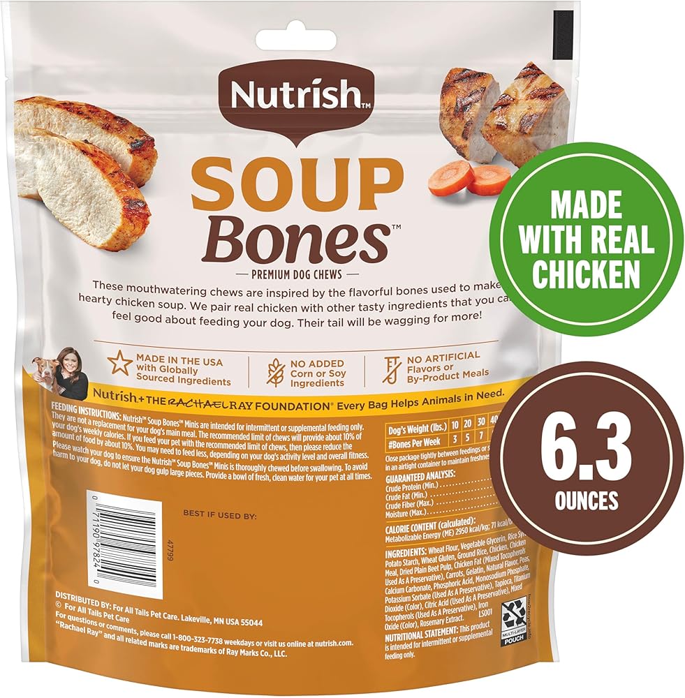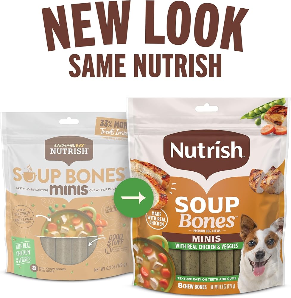 Contains six (6) 12.6 oz. pouches of Rachael Ray Nutrish Soup Bones Minis, Real Chicken & Veggies Flavor (96 dog chews total)