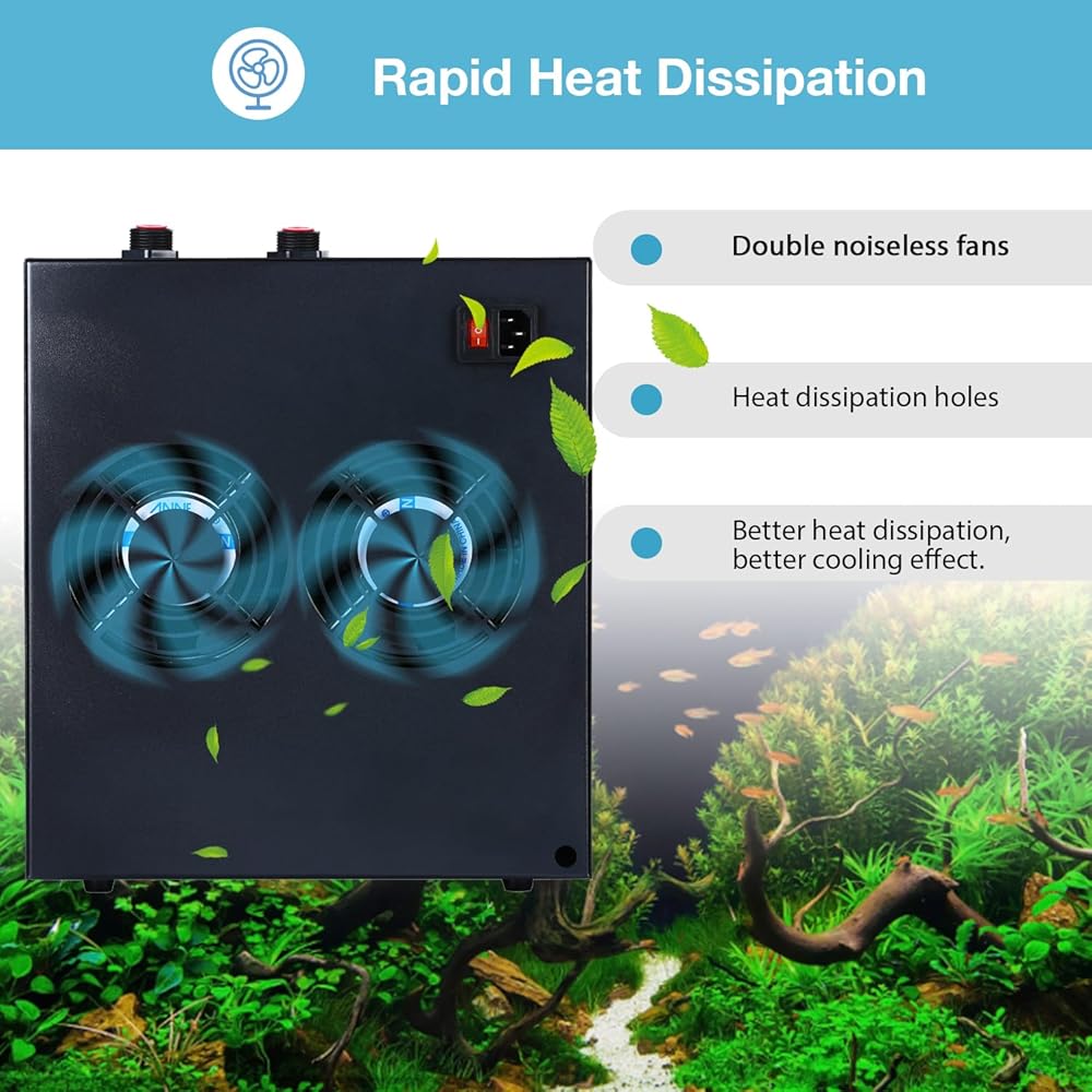 【فتحة تهوية حرارية بدون ضوضاء】مع مراوح مزدوجة بدون ضوضاء وتبريد ثلاثي الجوانب، تم تصميم مبرد حوض السمك Ezcasch ليناسب البيئات المختلفة. يمكن لنظام التهوية الجديد أن يوفر لك تأثيرًا أكثر فعالية وصوتًا منخفضًا (40 ديسيبل) مع ضمان استخدام المبرد على المدى الطويل. بالطبع، قد تحتاج إلى الانتباه إلى المساحة المخصصة لها لتبديد الحرارة. (حوالي 6 بوصات/15 سم)