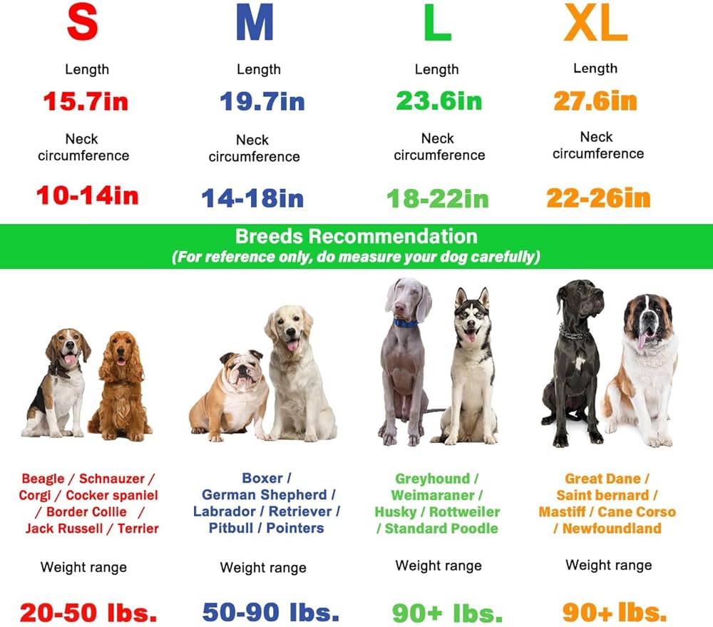 قم بالقياس قبل الشراء ⫸ قم بقياس رقبة كلبك وأضف 5 سم. تأتي كل حزمة مع وصلتين احتياطيتين للتعديل. يمكنك استخدام الكماشة لضبط طوق الاختناق للكلاب عن طريق إزالة الروابط أو إضافتها لتحقيق ملاءمة مريحة ودافئة. (شاهد فيديو المنتج لمعرفة كيفية الضبط)، مناسب للسلالات المتوسطة والكبيرة والكبيرة جدًا.