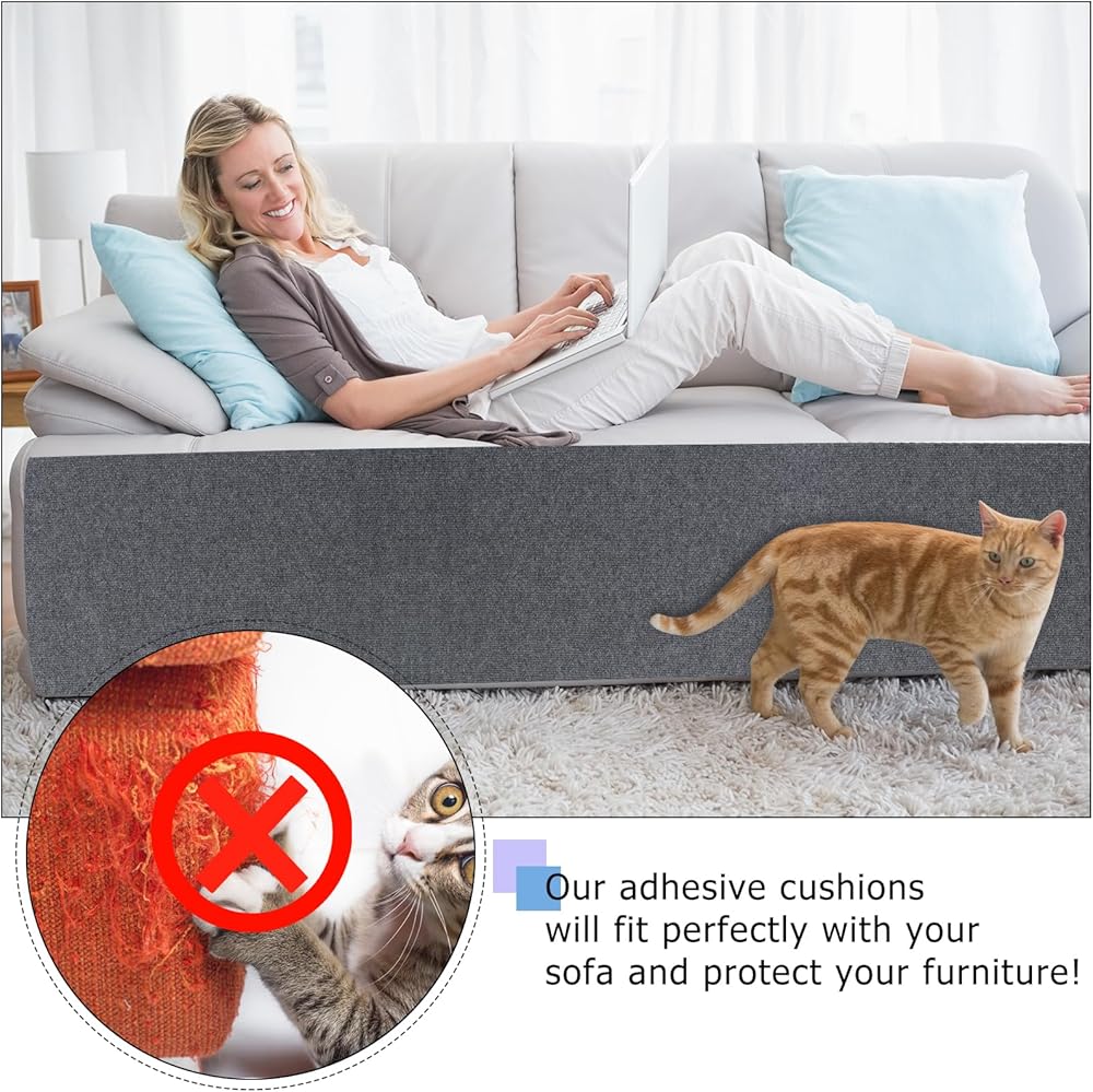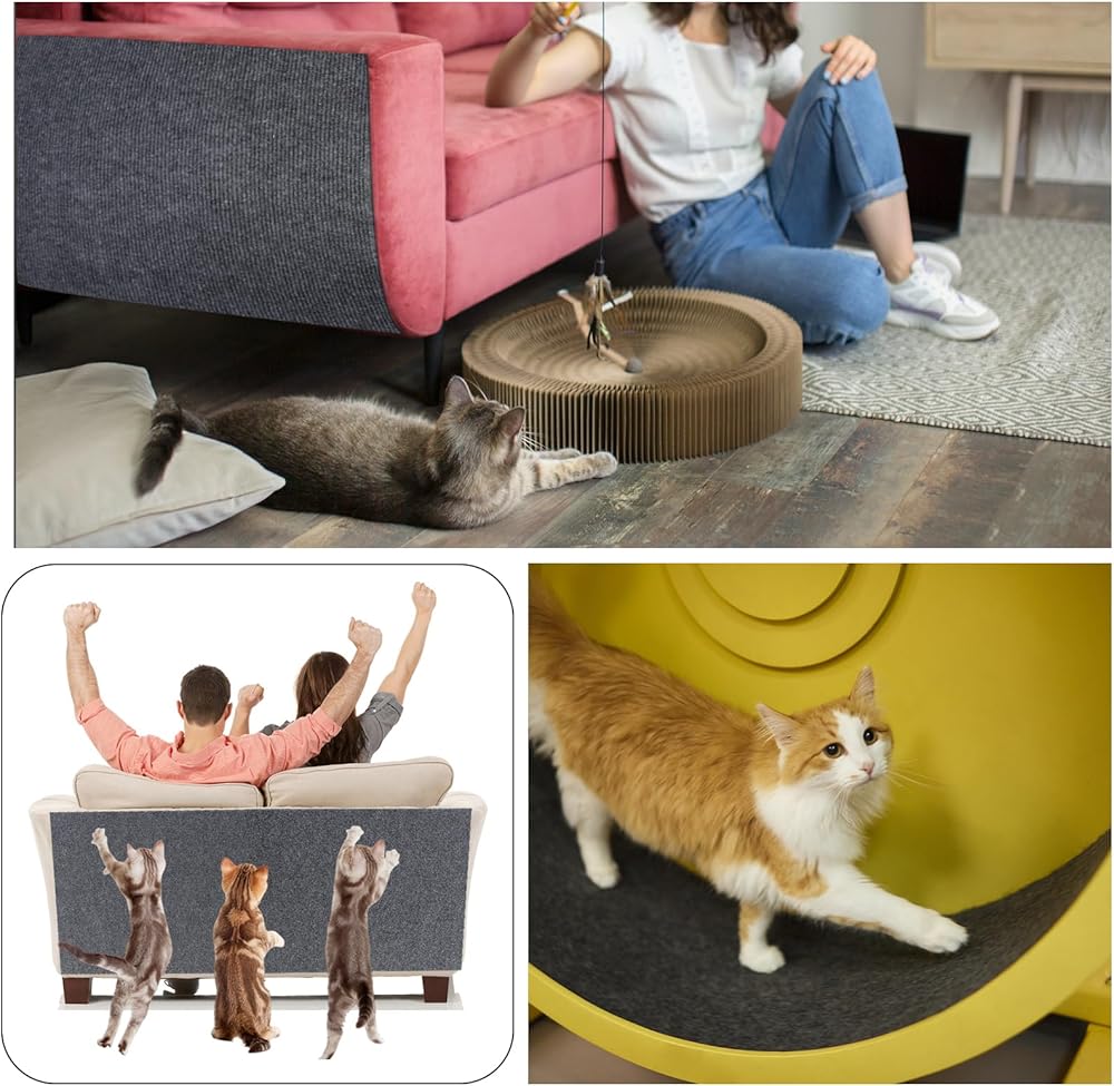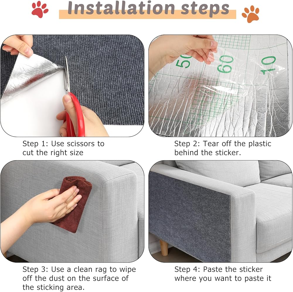 The style of cat scratching carpet features 98 inches x 15.4 inches x0.12 inches,can be cut into any size or shape freely to meet your daily usage needing.Cat scratching sofa protector made of high quality polyester fibre with scratching prong design on the surface,self-adhesive material at the bottom,adheres to any wood, glass, linen, cotton or leather surface securely without the need for screws, nails or other mounting tools.