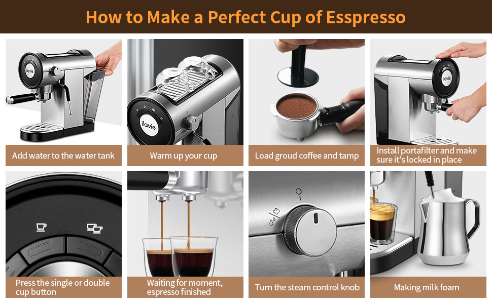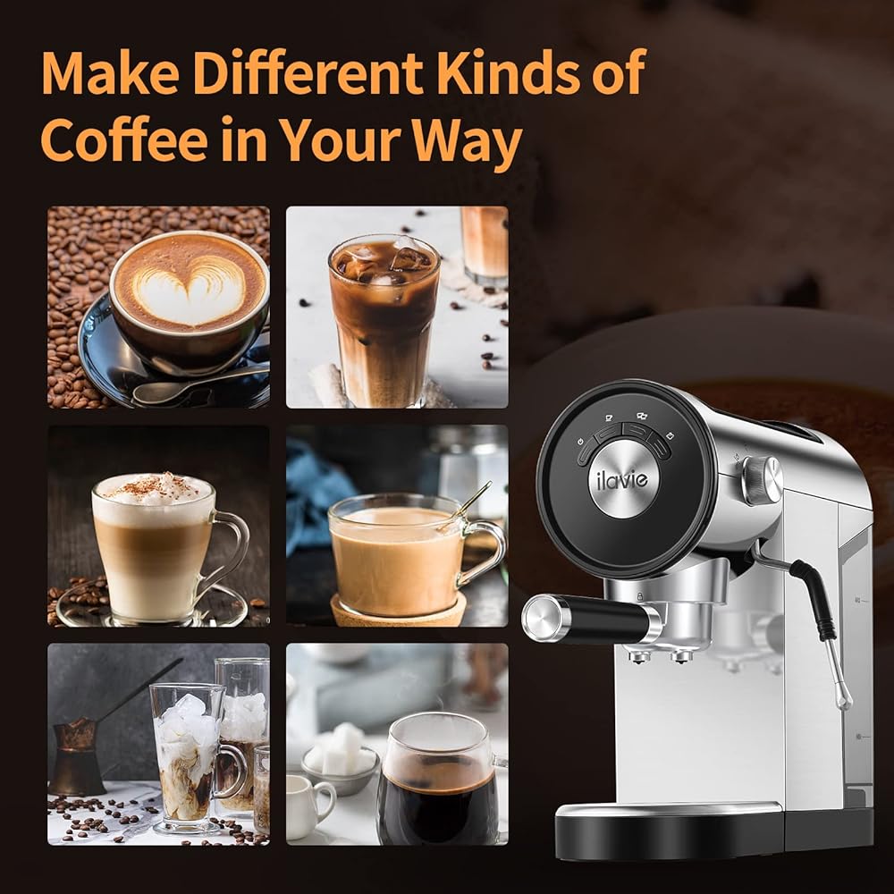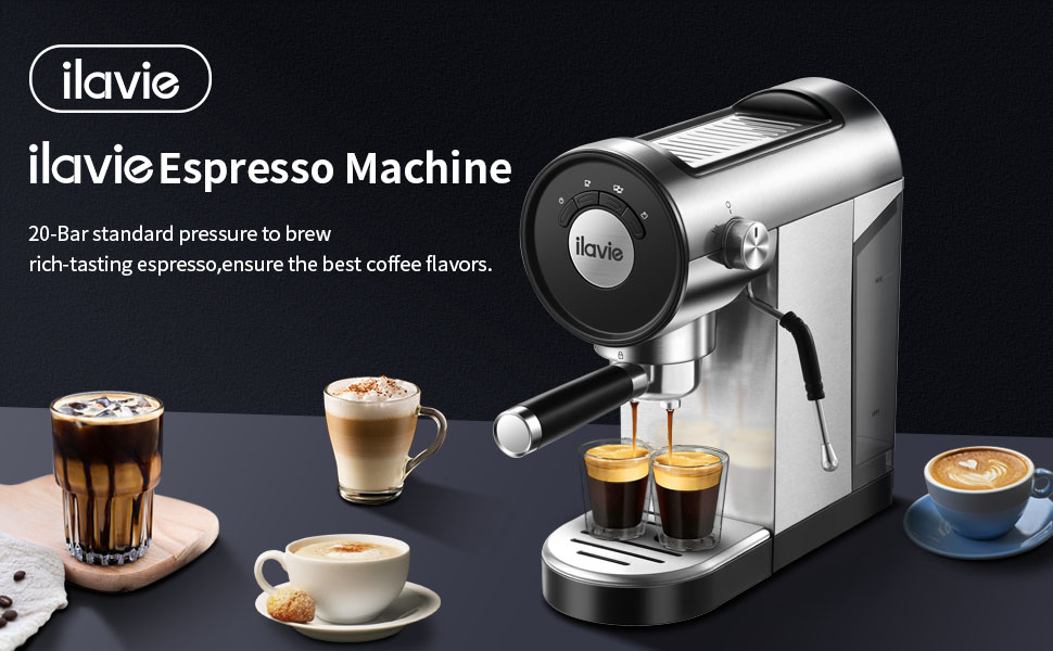 • [نظام ضغط عالي 20 بار] ماكينة اسبريسو ILAVIE مجهزة بمضخة ضغط عالي 20 بار ونظام تسخين قوي 1250 وات، مما يجعل الإسبريسو أكثر عطرًا وغنيًا بالكريمة، كما أنها مريحة لصنع اللاتيه والكابتشينو وإسبريسو آخر في المنزل أو مكتب، وقت تخمير سريع 25-45 ثانية، لديك متسع من الوقت لصنع كوب من القهوة.