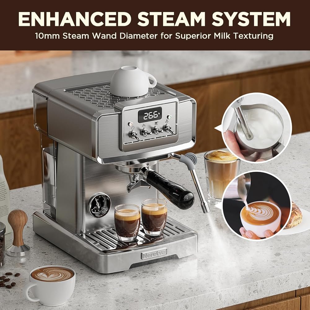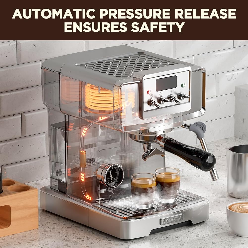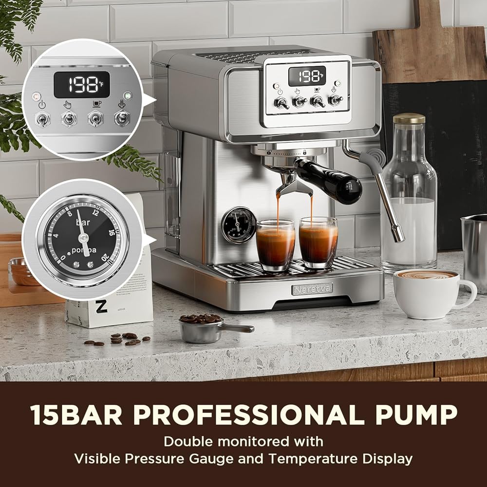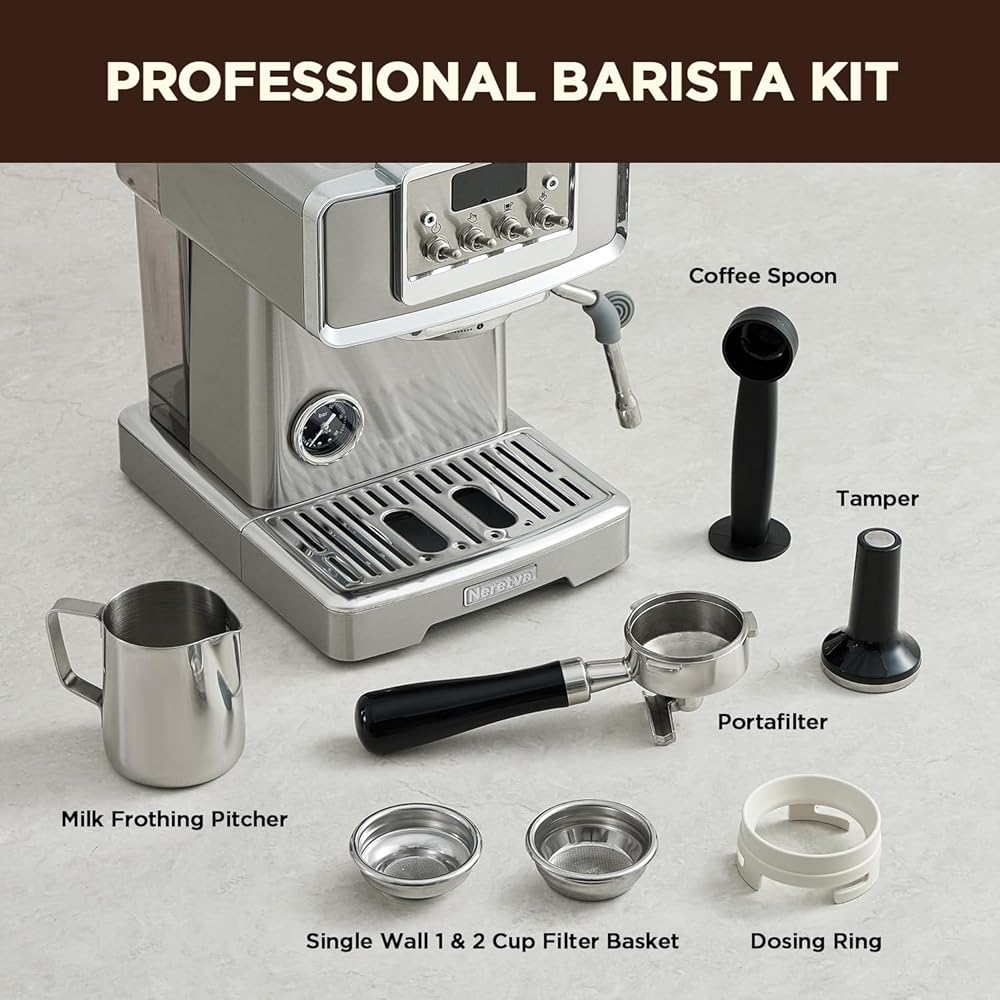 👍باريستا احترافية للمنزل👍 تستخدم ماكينة صنع القهوة نيريتفا مضخة احترافية قوية بقوة 15 بار ونظام تسخين عالي الطاقة بقدرة 1450 وات، مما يضمن استخلاص كريمة القهوة بشكل مثالي. يتم مراقبته عن كثب بواسطة مقياس ضغط مرئي وشاشة عرض لدرجة الحرارة، ويوفر قراءات دقيقة للضغط ودرجة الحرارة ووقت التخمير، مما يتيح لك التعديل وفقًا لتفضيلات ذوقك. لا يضيف التصميم الأنيق المصنوع من الفولاذ المقاوم للصدأ لآلة الإسبريسو الأناقة فحسب، بل يضمن أيضًا المتانة، مما يجعلها مناسبة تمامًا لأي مطبخ.