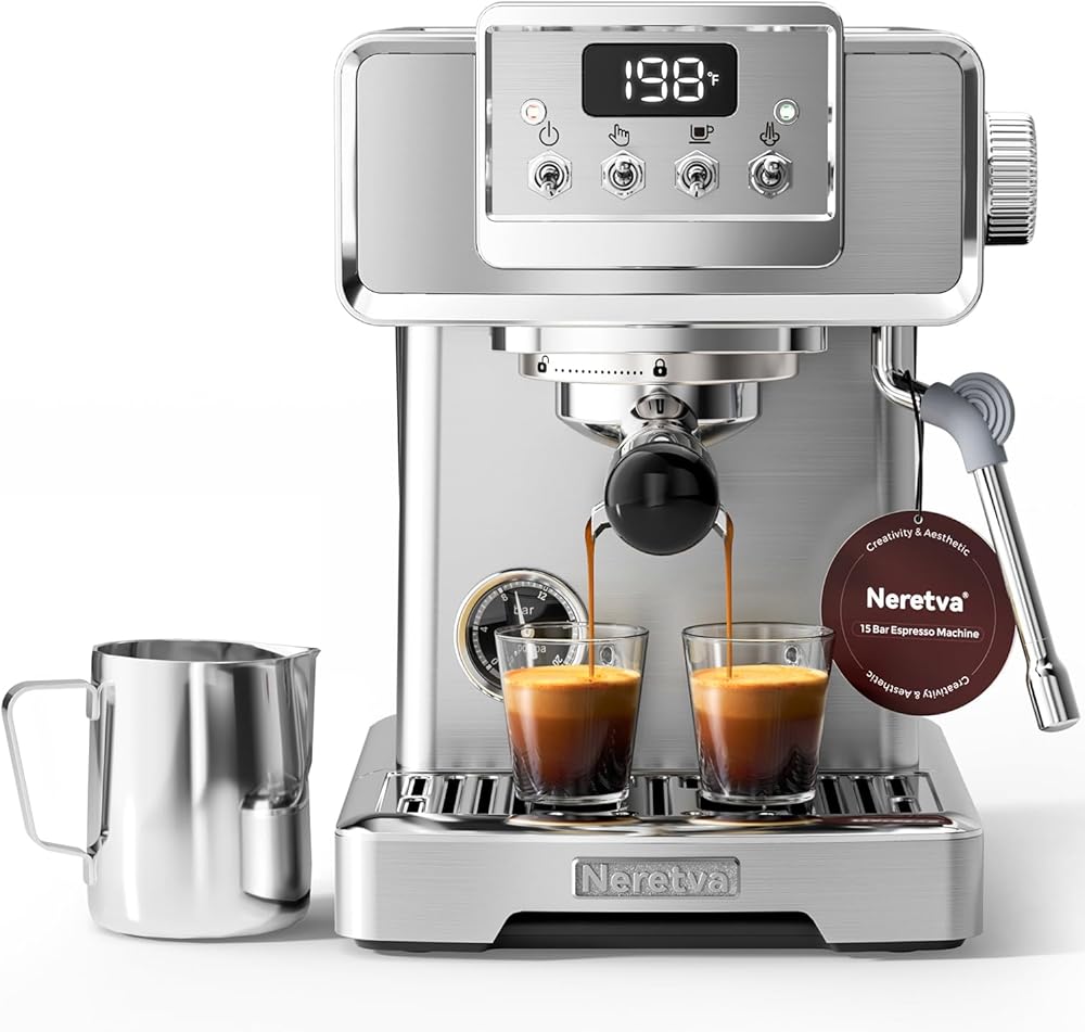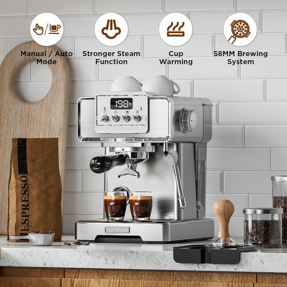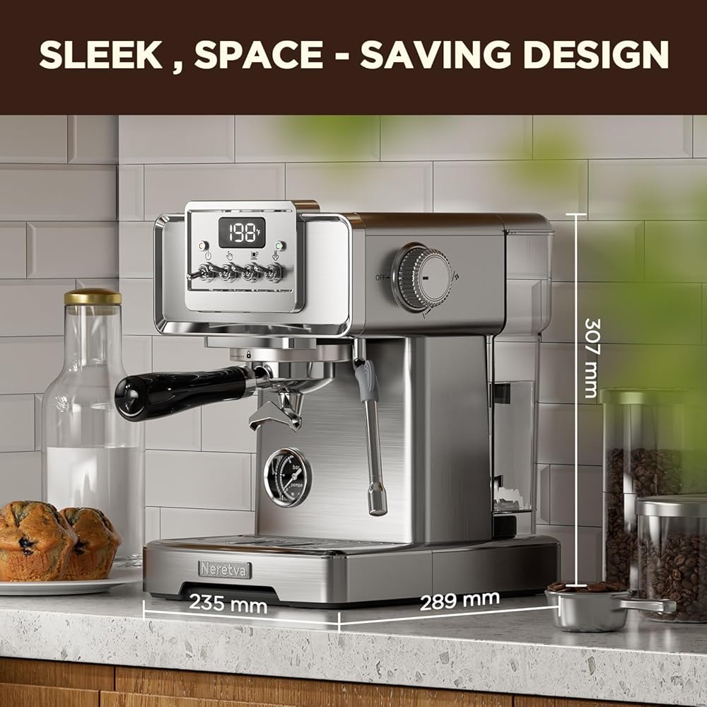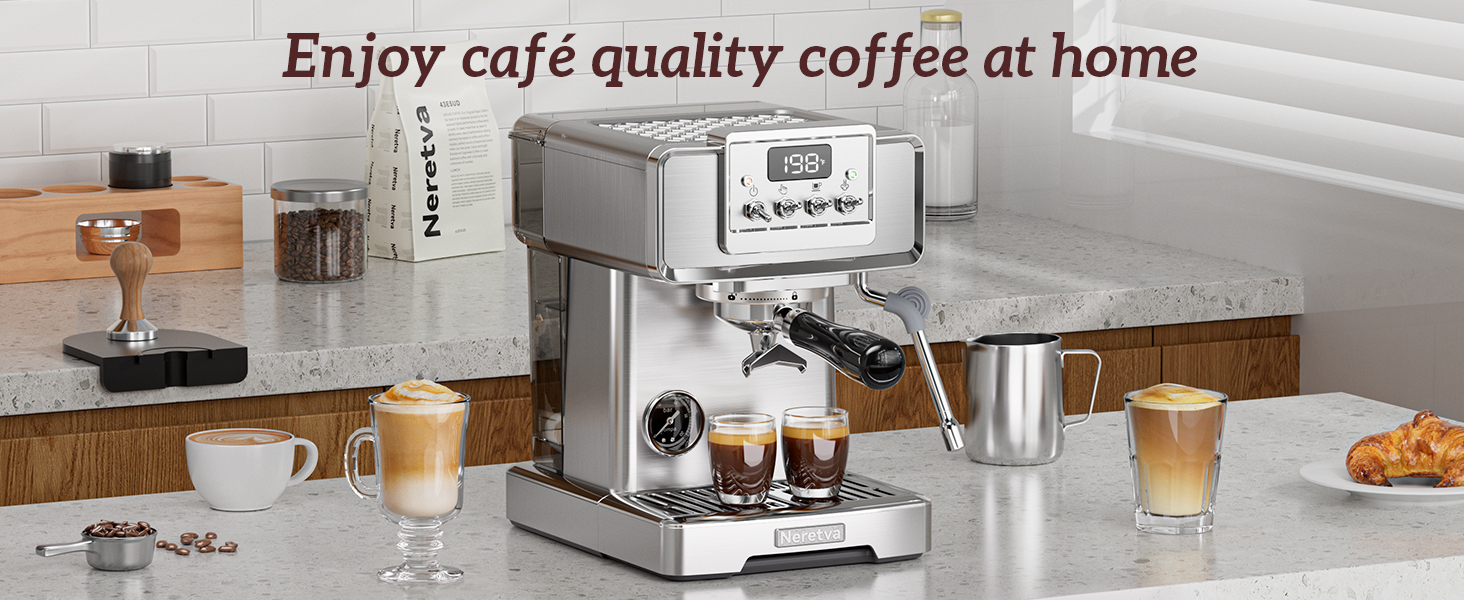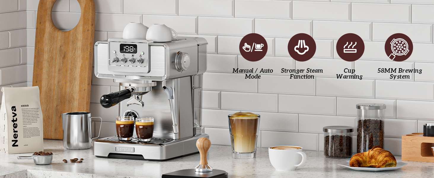👍باريستا احترافية للمنزل👍 تستخدم ماكينة صنع القهوة نيريتفا مضخة احترافية قوية بقوة 15 بار ونظام تسخين عالي الطاقة بقدرة 1450 وات، مما يضمن استخلاص كريمة القهوة بشكل مثالي. يتم مراقبته عن كثب بواسطة مقياس ضغط مرئي وشاشة عرض لدرجة الحرارة، ويوفر قراءات دقيقة للضغط ودرجة الحرارة ووقت التخمير، مما يتيح لك التعديل وفقًا لتفضيلات ذوقك. لا يضيف التصميم الأنيق المصنوع من الفولاذ المقاوم للصدأ لآلة الإسبريسو الأناقة فحسب، بل يضمن أيضًا المتانة، مما يجعلها مناسبة تمامًا لأي مطبخ.