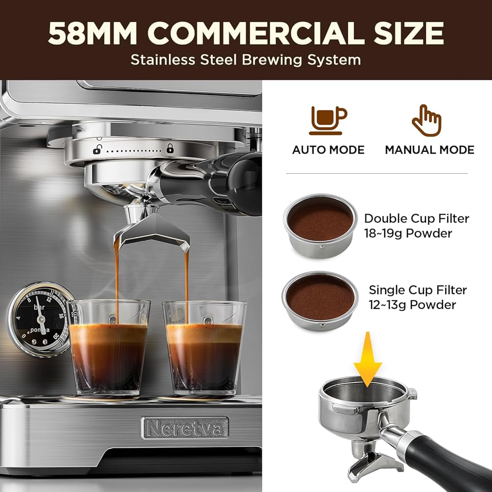 ❤️رضاك والتزامنا❤️ في نيريتفا، نعطي الأولوية لرضاك. يأتي كل منتج من منتجاتنا مع دعم فني مدى الحياة. إذا واجهت أي مشاكل مع ماكينات قهوة Neretva espresso الخاصة بك، فإن فريق خدمة العملاء المخصص لدينا موجود لمساعدتك. | ما الذي ستحصل عليه؟ - ماكينة صنع الإسبريسو، فلتر القهوة، 2 فلتر، ملعقة قهوة، حلقة الجرعات، إبريق رغوة الحليب، المدك ودليل المستخدم.