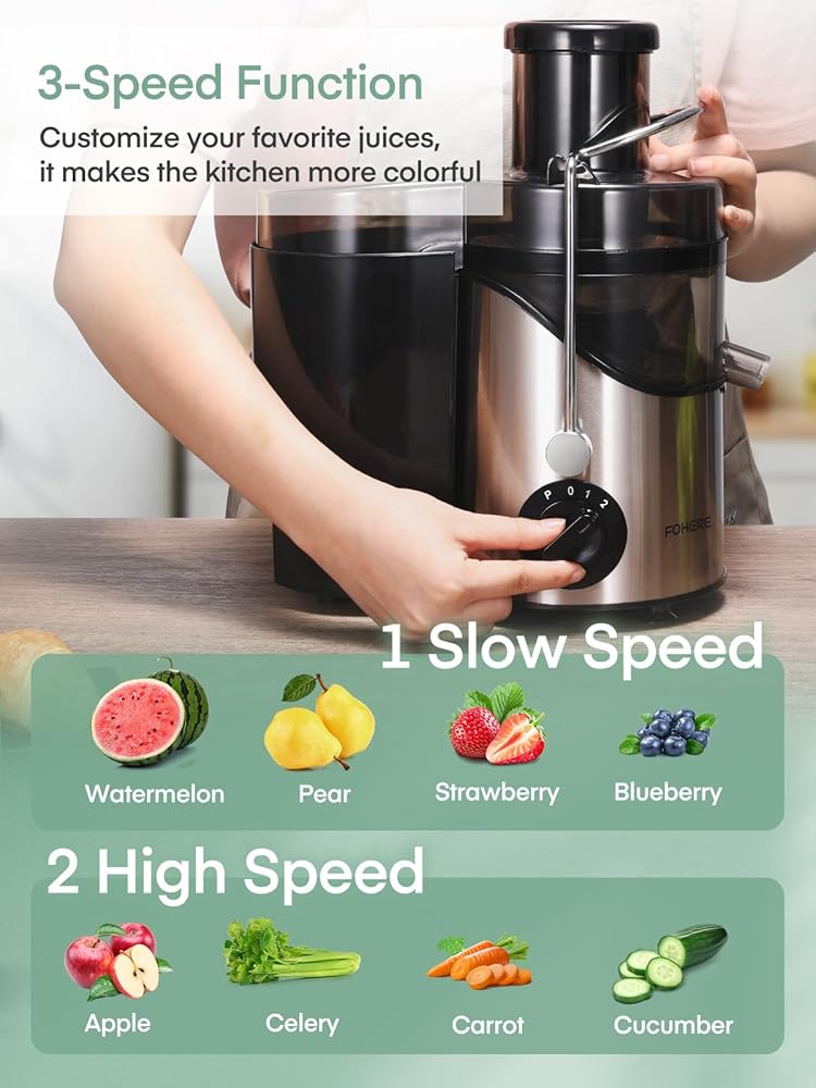 🍊 إعدادات 3 سرعات - عصارة مع تحكم في 3 سرعات (12000-18000 دورة في الدقيقة)، سرعة منخفضة "1" للفواكه الناعمة والخضروات مثل البطيخ، إلخ. سرعة عالية "2" لبعض الفواكه والخضروات الصلبة، مثل الكرفس، الجزر، واللفت، والتفاح، وما إلى ذلك. السرعة الفورية "P"، والتي تمنحك دفعة إضافية عندما تحتاج إليها.