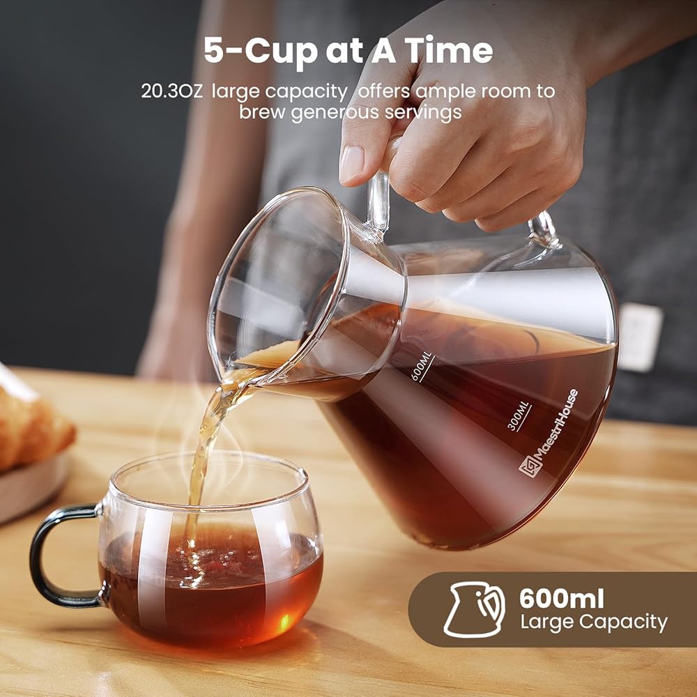 【وعاء زجاجي مقاوم للحرارة】وعاء قهوة يُسكب بسعة 600 مل مصنوع من زجاج شفاف سميك الجدران ومقاوم للحرارة من البورسليكات العالي، بينما يكون آمنًا أيضًا في غسالة الأطباق، ومقاومًا لدرجات الحرارة الساخنة والباردة حتى 365 درجة فهرنهايت (-4 درجات فهرنهايت). 320 درجة فهرنهايت)