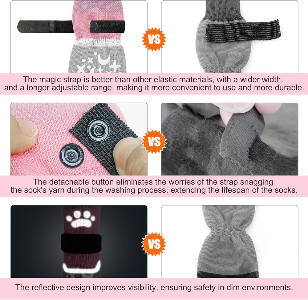 مضاد للسقوط: يمكنك أن ترى أن هناك حزام قابل للتعديل والفصل على كل جورب للكلاب، مما يحافظ على أقدام حيوانك الأليف ملفوفة بإحكام. يمكنك استخدام حلقة تثبيت مرنة سوداء لضبط إحكام جورب كلبك، وذلك لجعل كلبك تشعر بالراحة والدفء وتمنع طفلك من سقوط الجورب أثناء المشي أو الجري.