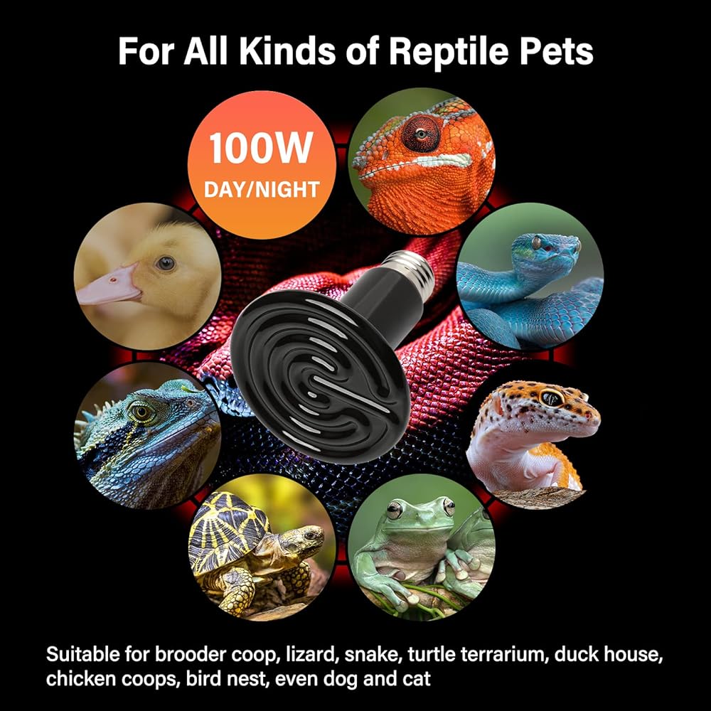 【Specifications】150W 110-120V 2 pack; for use in standard E26 lamp base; 85mm diameter, 100mm length. Note: High surface temperature, please do not test temperature using your hands; please adjust the spacing between lamp and your pets, too close will case overheating the habitat; keep distance from flammable materials
