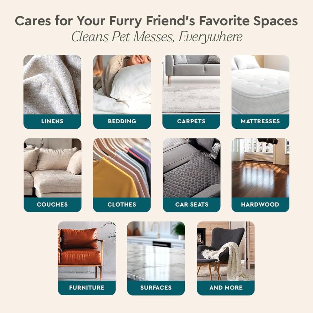 آمن لعائلتك وأغراضك: عند استخدامه وفقًا للتعليمات، فهو غير سام تمامًا للأشخاص والحيوانات؛ استخدمه على السجاد أو السجاد أو الأرضيات أو الحصير أو الأسرة أو المناشف أو أي سطح آخر يتركه حيوانك الأليف مفاجأة.