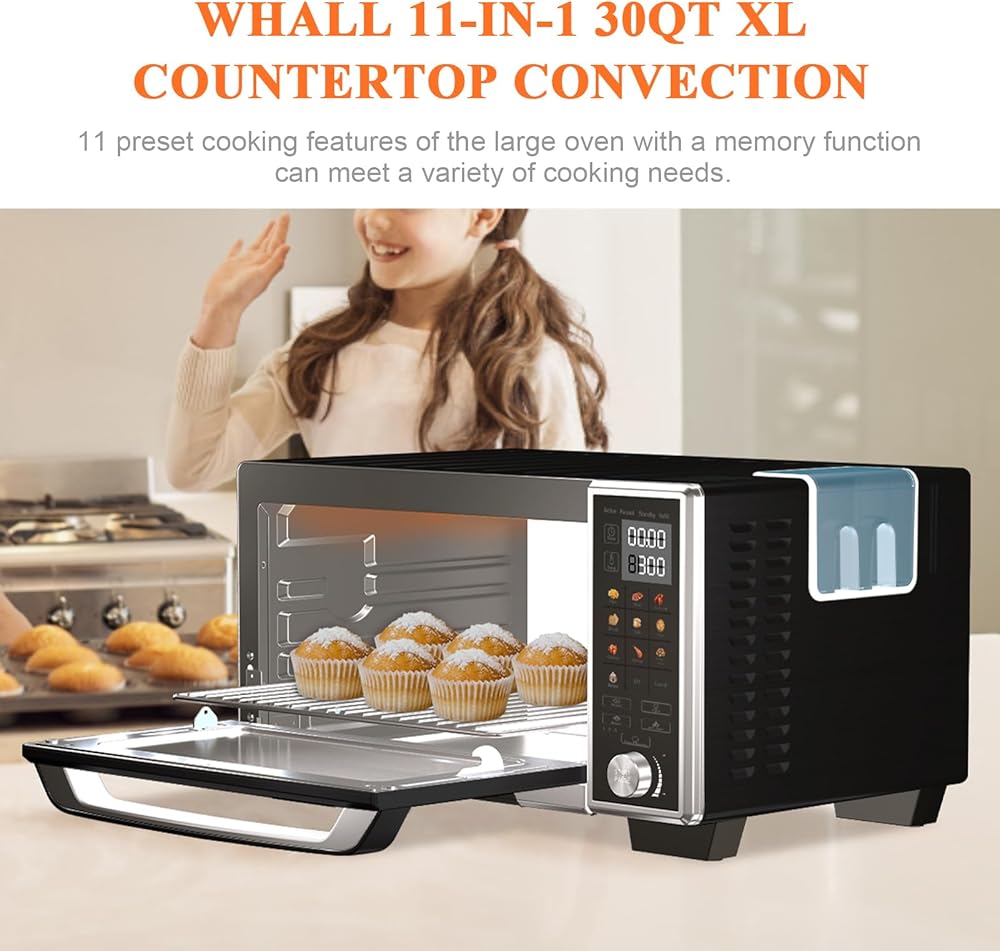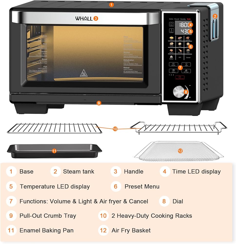 فرن مقلاة هوائية من وول، فرن حراري ذكي كبير الحجم ماكس XL بسعة 30 لتر، فرن محمصة 11 في 1 مع وظيفة البخار، بيتزا 12 بوصة، 6 شرائح من الخبز المحمص، 4 ملحقات متضمنة، ستانلس ستيل / 1700 وات، أسود
