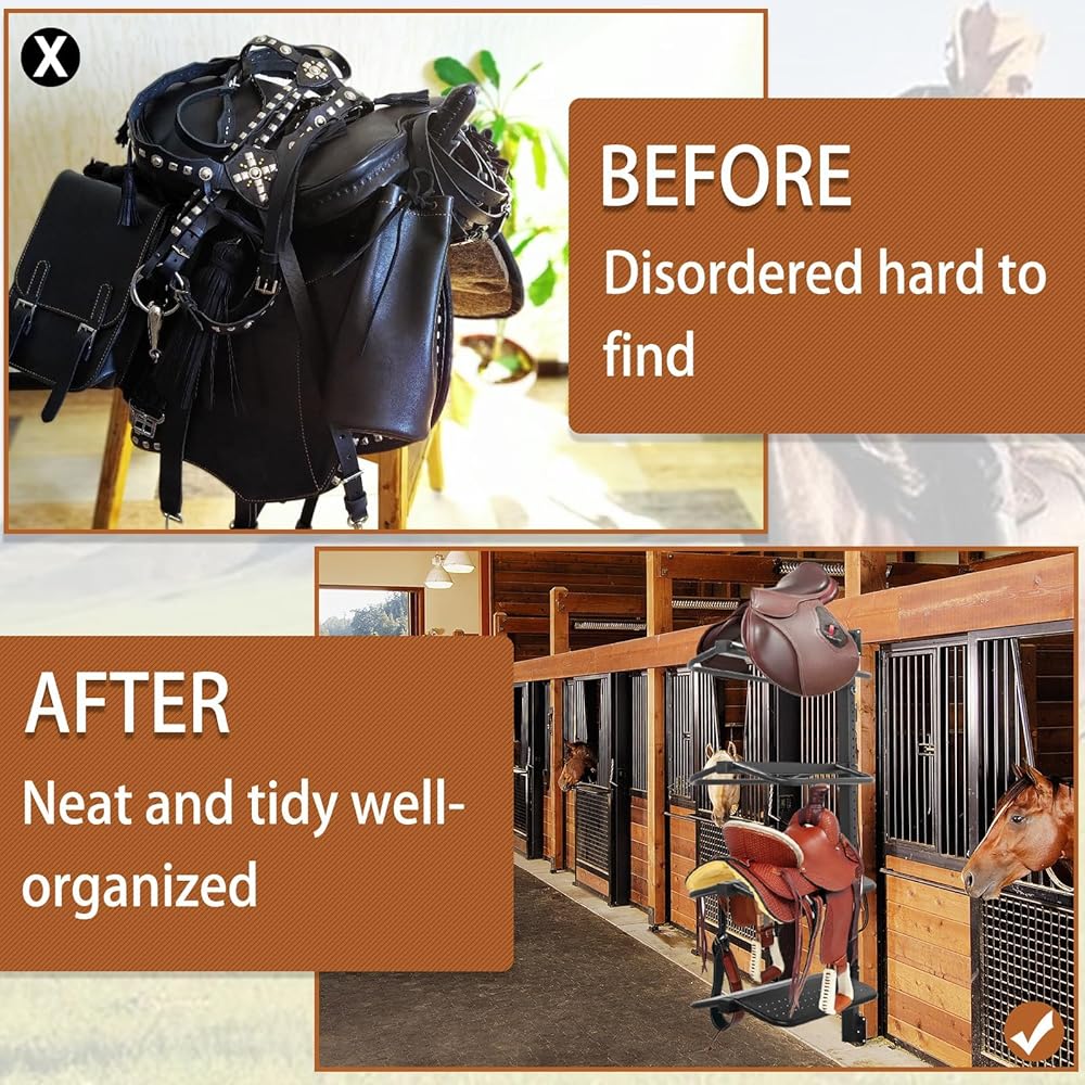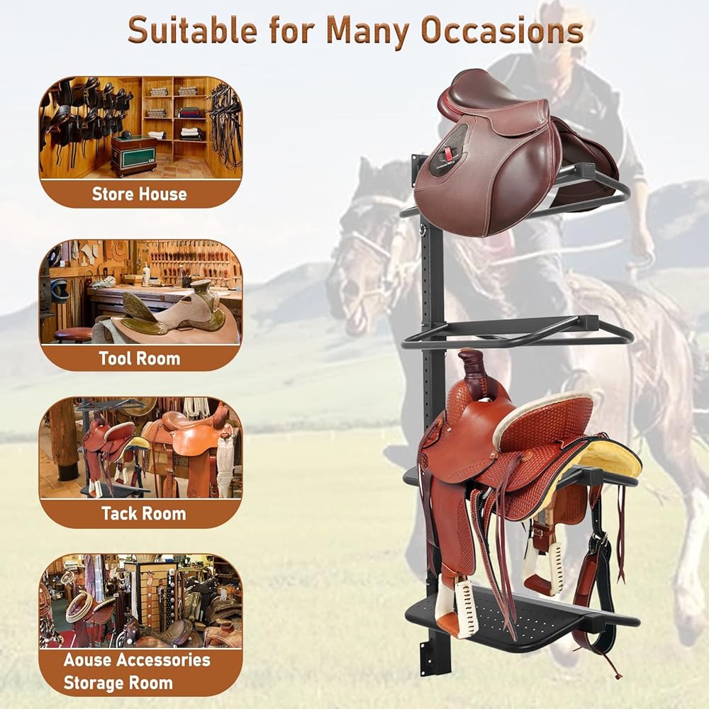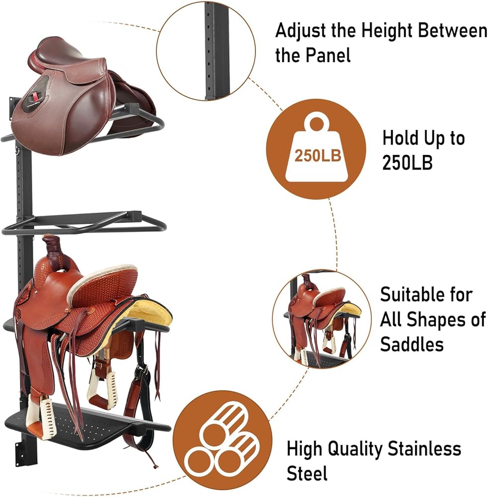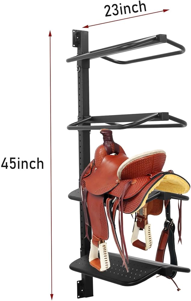 حامل سرج، حامل سرج من 4 طبقات مثبت على الحائط للسرج الغربي والإنجليزي - يدعم حتى 250 رطل، يحمل المسكة والوسادة والإكسسوارات وما إلى ذلك للخيول (النوع المتكامل من الفولاذ)