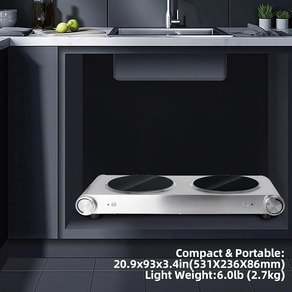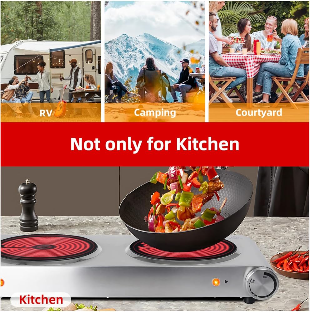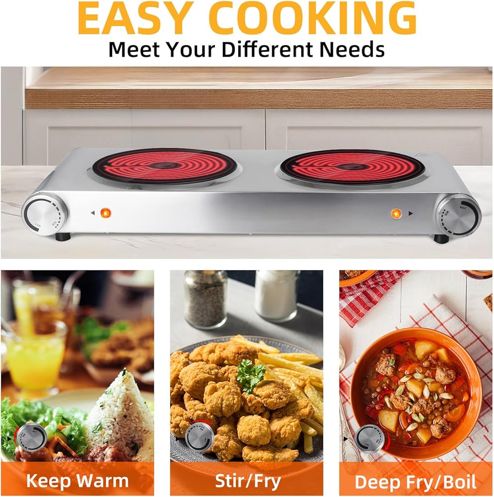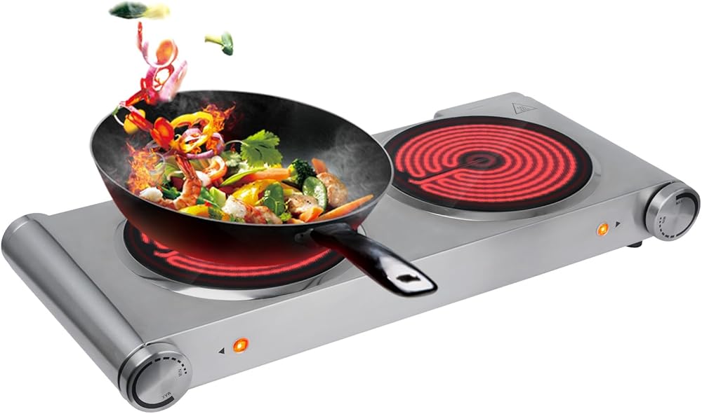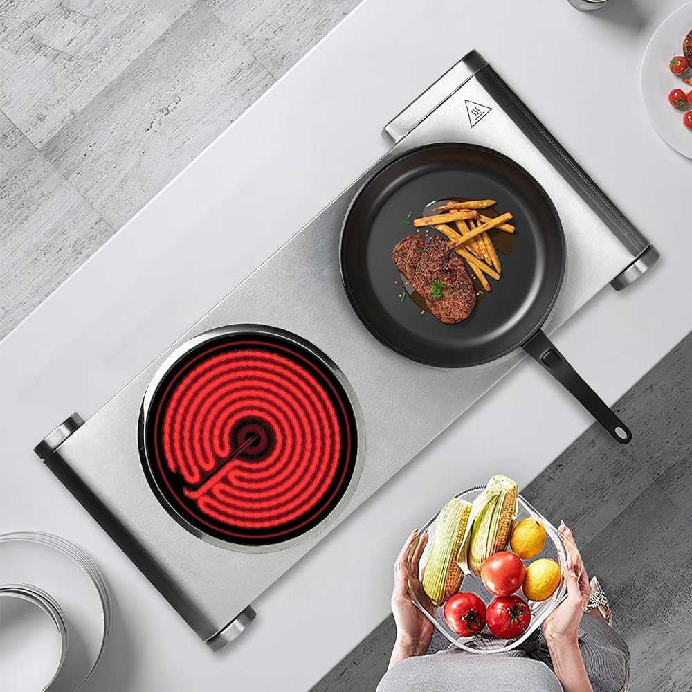 مناطق تسخين مزدوجة: ألواح سيراميك مزدوجة بقدرة 900 واط تسمح برفاهية إعداد وجبتين مختلفتين في نفس الوقت، مما يجعلها مثالية لجلسات الطهي المزدحمة.