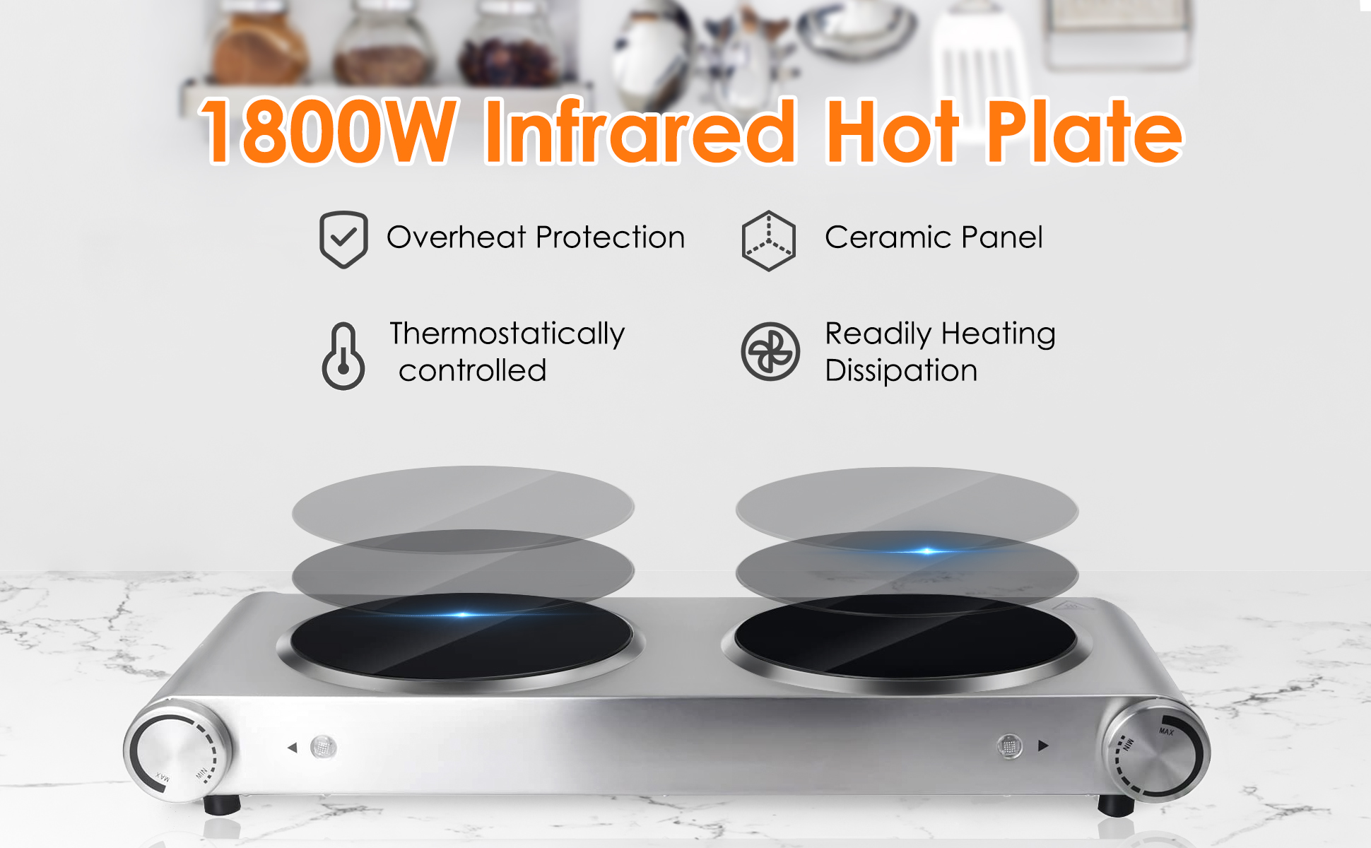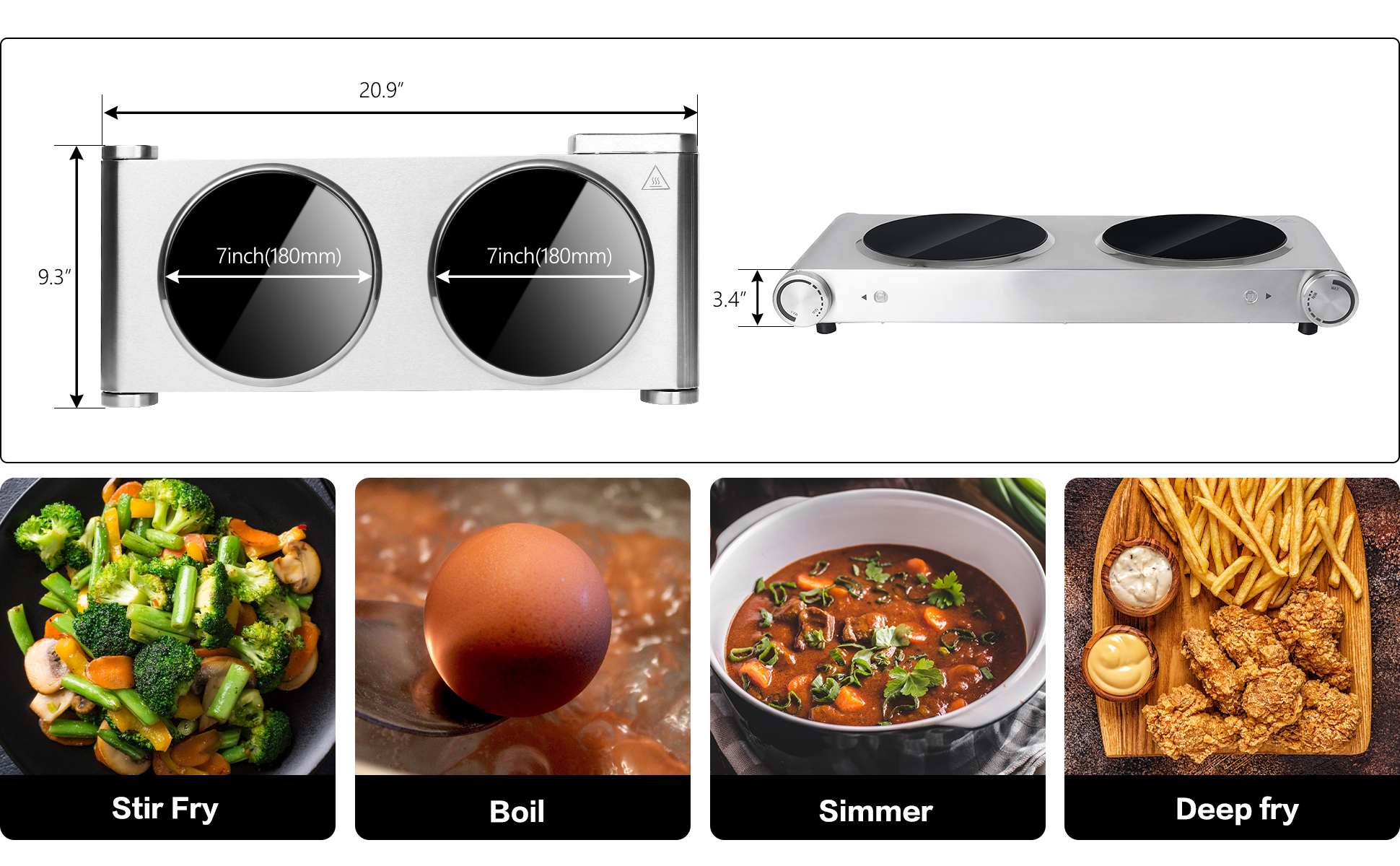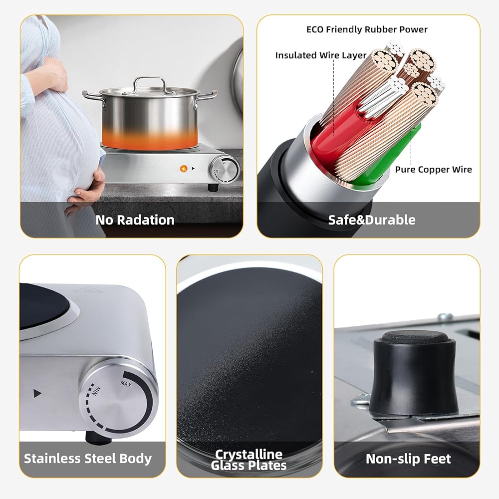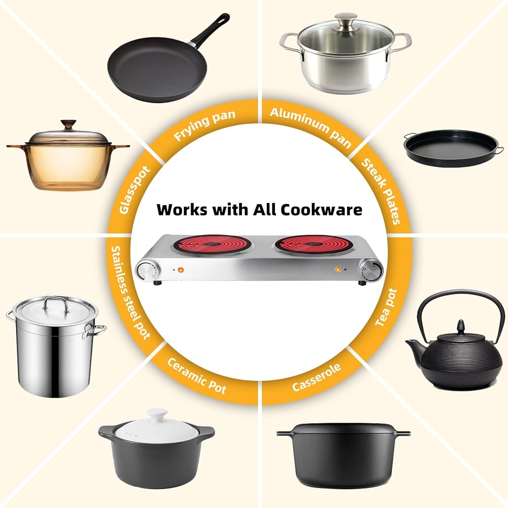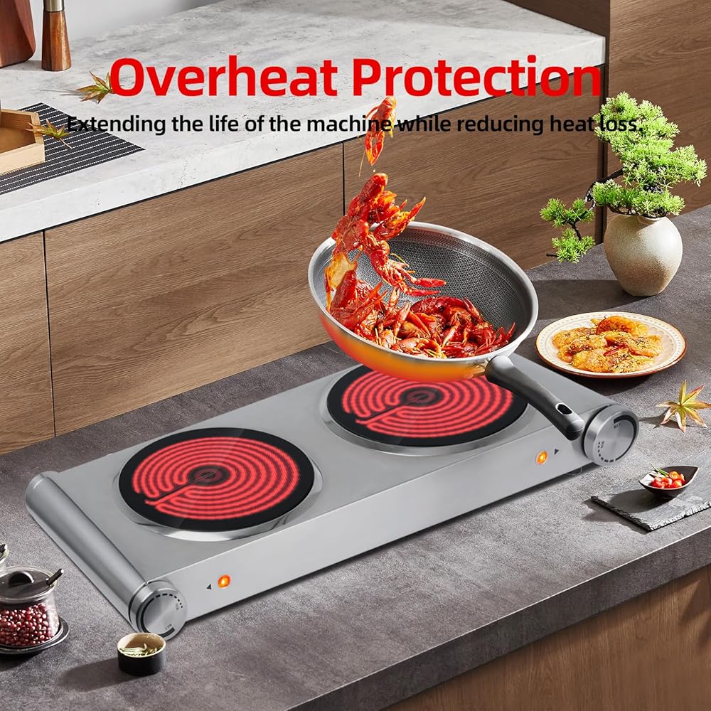 مناطق تسخين مزدوجة: ألواح سيراميك مزدوجة بقدرة 900 واط تسمح برفاهية إعداد وجبتين مختلفتين في نفس الوقت، مما يجعلها مثالية لجلسات الطهي المزدحمة.