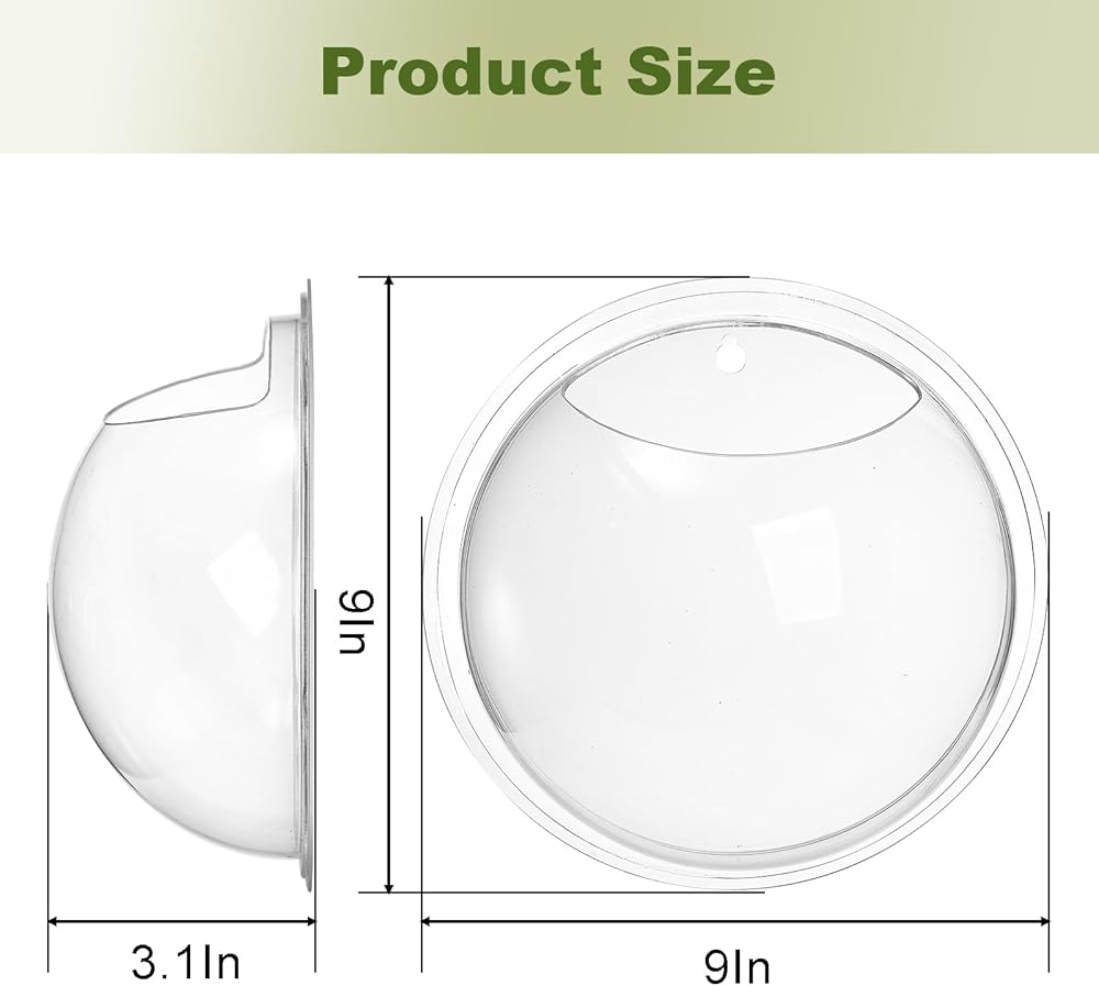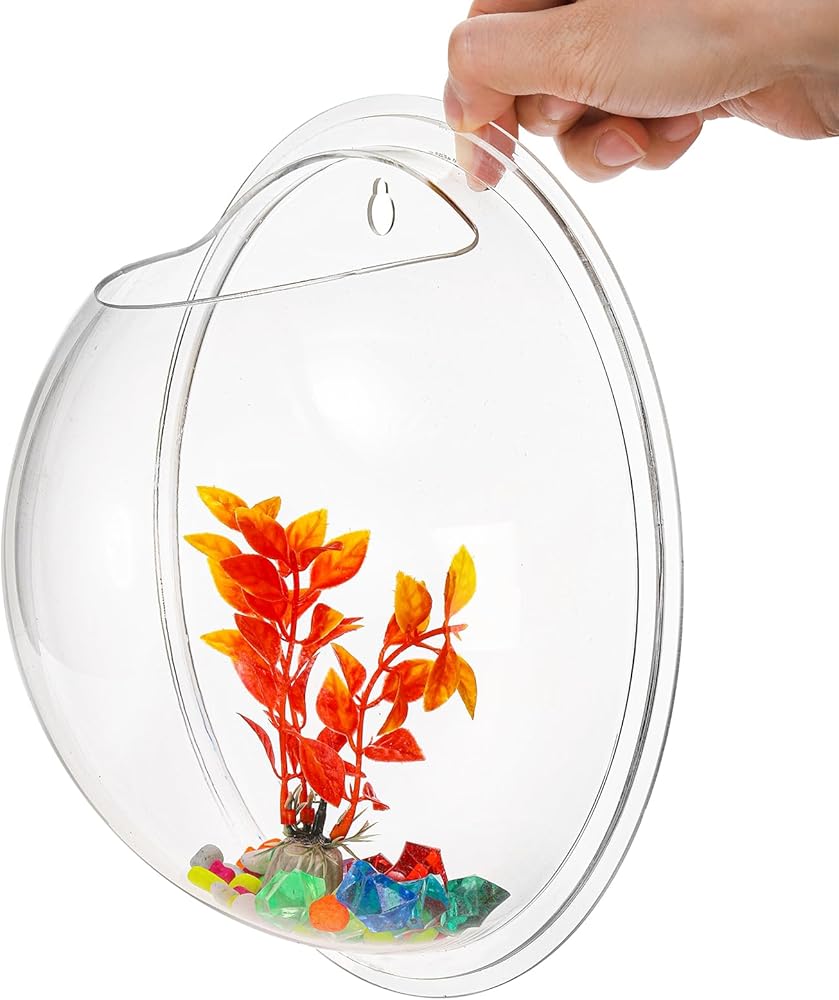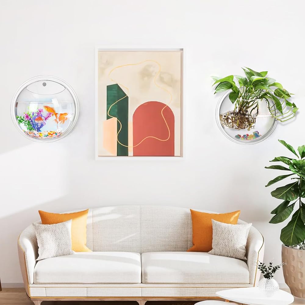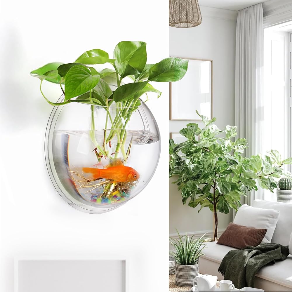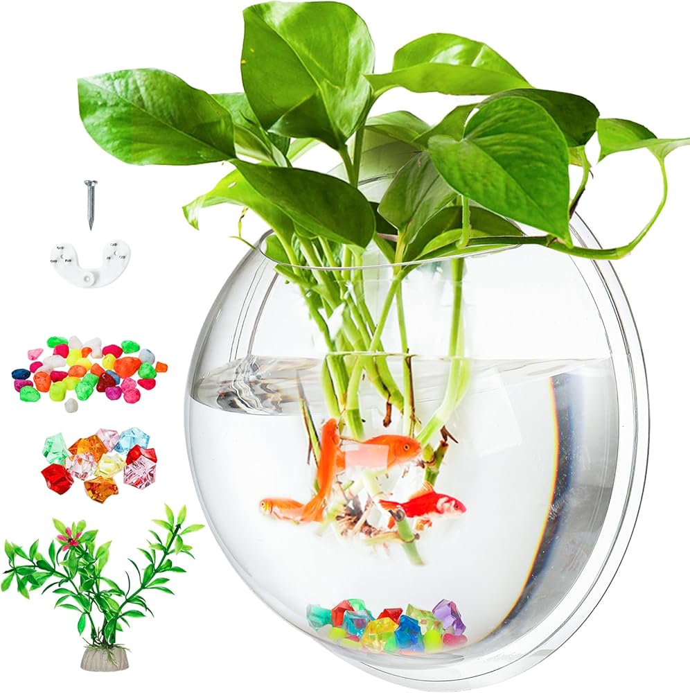 wuweot خزان الأسماك المعلق على الحائط، 9 بوصة نبات الأكريليك تررم حوض السمك حوض السمك، ديكور الحائط فقاعة الأسماك النباتية مع النباتات وهمية والحجر الملون (0.5 جالون السمك)