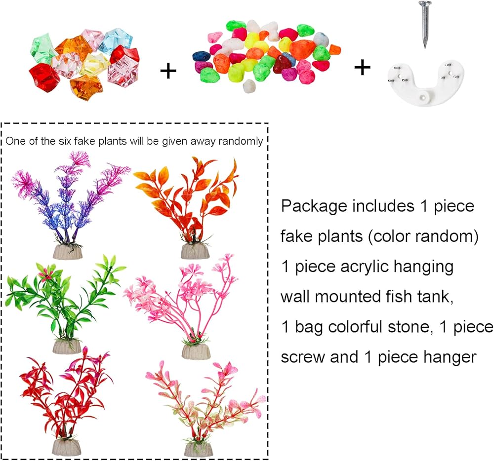 تحتوي العبوة على قطعة واحدة من حوض السمك المثبت على الحائط من الأكريليك، وحقيبة واحدة من الحجر الملون (لون عشوائي)، وحزمة واحدة من النباتات المزيفة (لون عشوائي). لا يمكن لوعاء السمك الجداري هذا أن يزين حائطك فحسب، بل يمكنه أيضًا زيادة المساحة الخاصة بك لأنه لا يحتاج إلى مساحة منضدة أو طاولة