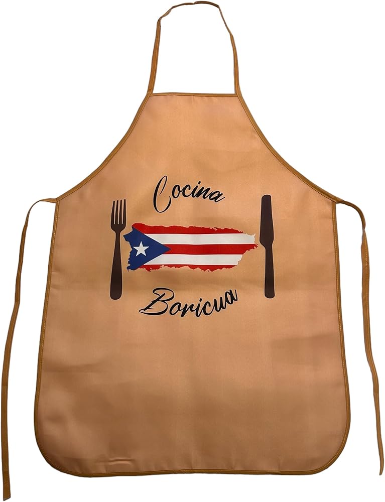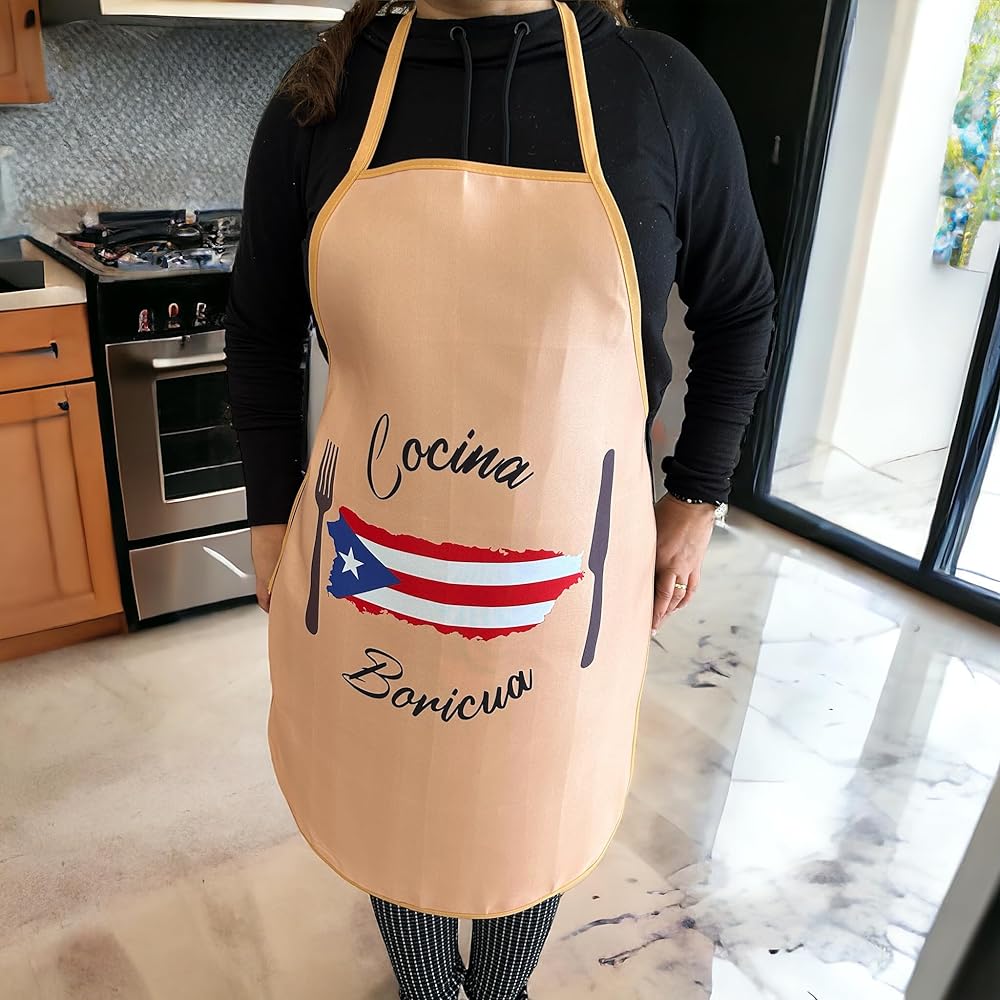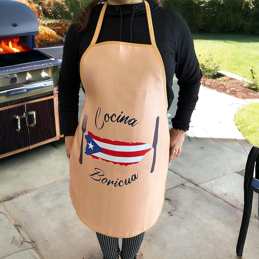 This polyester apron features the Puerto Rican flag, offering durability and easy care.. It's unisex with adjustable ties for a comfortable fit . Ideal for cooking or grilling, it celebrates Puerto Rican pride. The apron showcases the iconic red, white, and blue of the Puerto Rican flag, with its solitary star prominently displayed, symbolizing the Commonwealth's pride and cultural heritage. It's an ideal gift for culinary aficionados and Puerto Rican patriots alike, perfect for cooking, grillin
