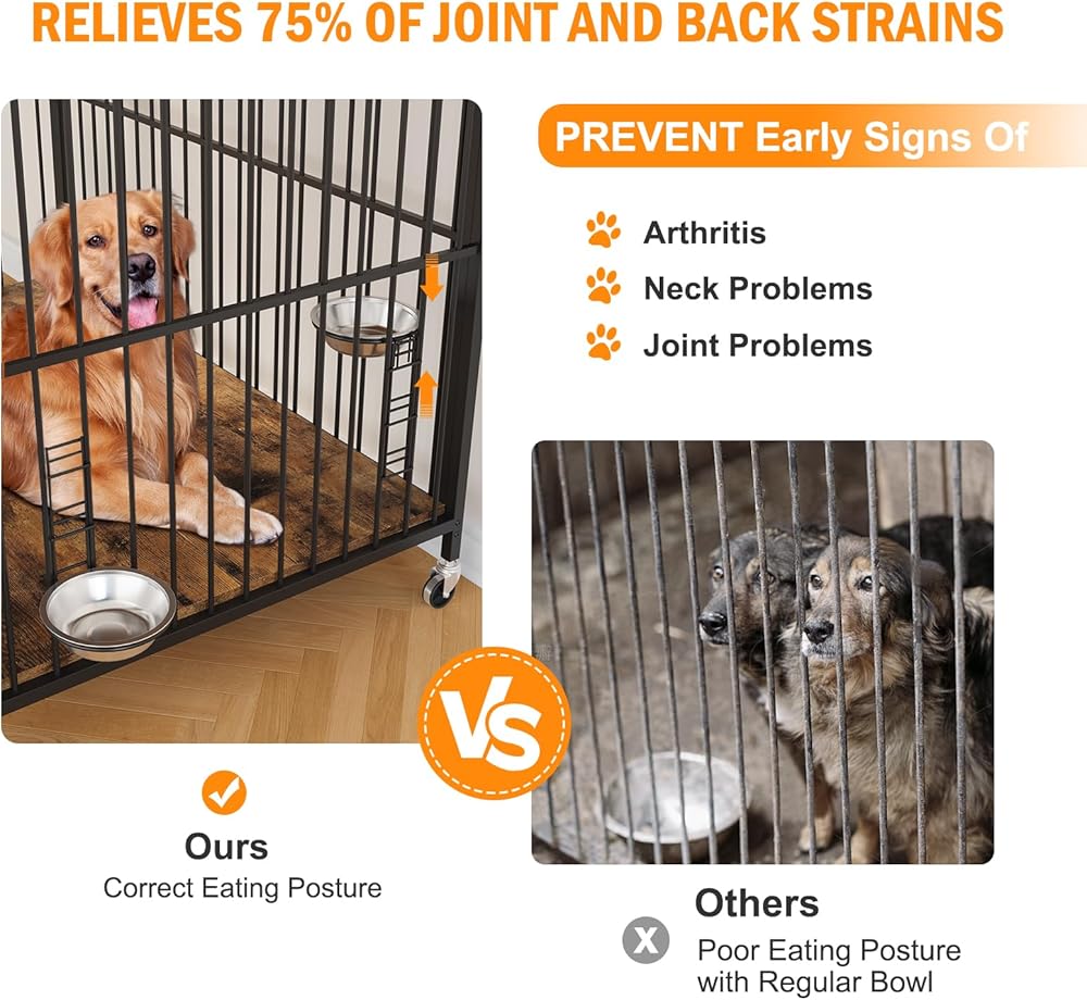 2. وحدة تغذية ذات ارتفاع قابل للتعديل: عزز تجربة تناول الطعام لكلبك من خلال قفص الكلاب المصمم بعناية والذي يشتمل على وحدة تغذية قابلة للتعديل. تتميز بوعاءين من الفولاذ المقاوم للصدأ، ويمكن تعديل وحدة التغذية هذه بسهولة لتناسب مستوى راحة حيوانك الأليف، مما يساعد على منع إجهاد الظهر أثناء أوقات الوجبات. مثالية لأي كلب، تضمن هذه الميزة أن يكون تناول الطعام مريحًا وآمنًا، مما يجعلها إضافة مثالية لأولئك الذين يبحثون عن أثاث قفص الكلاب العصري.