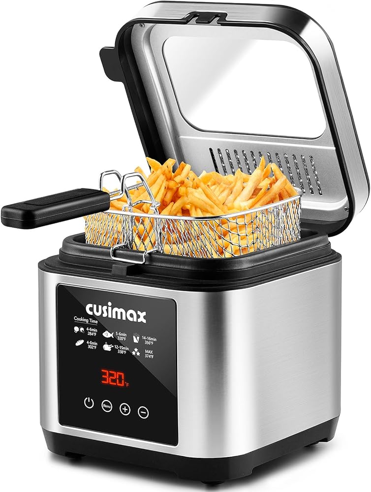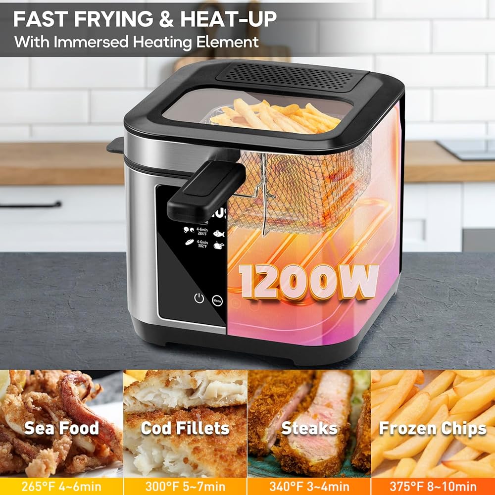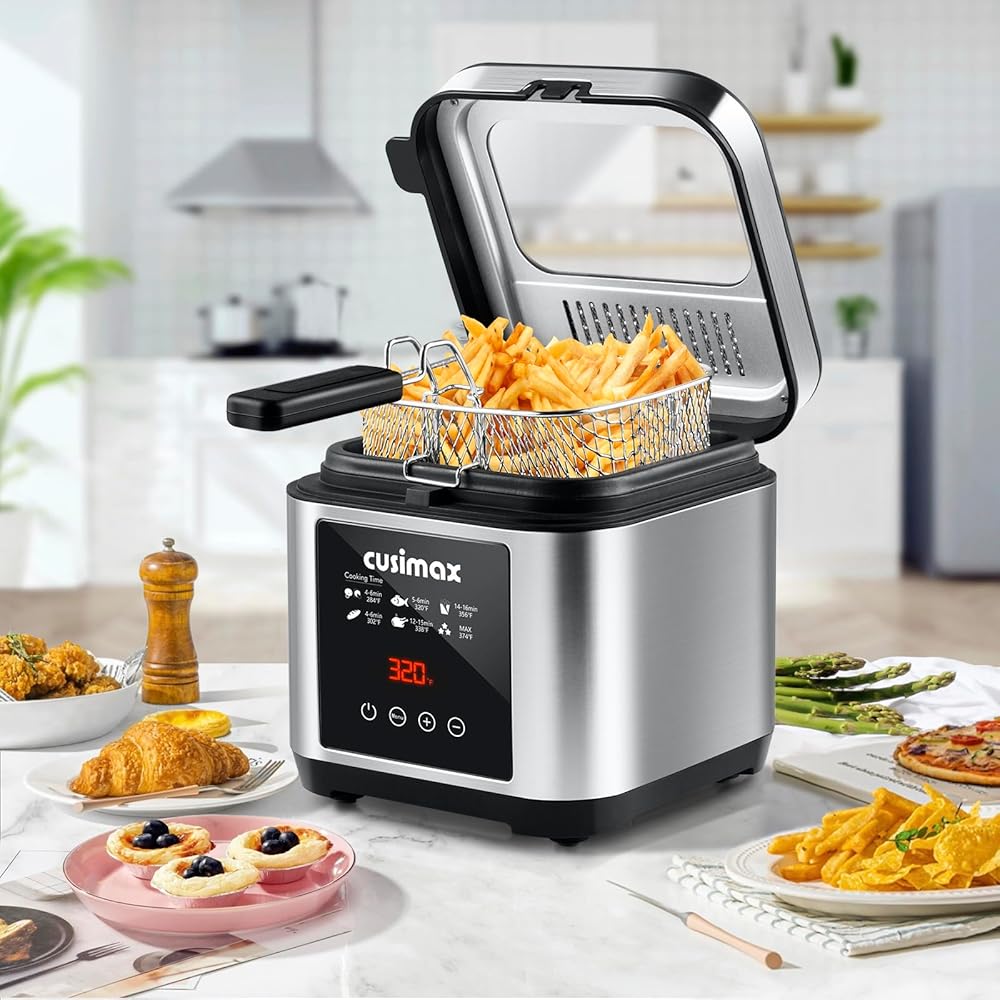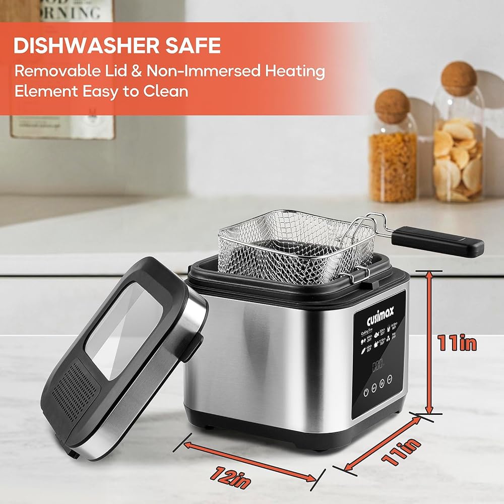 مقلاة عميقة مع سلة من كيوسيماكس، مقلاة كهربائية صغيرة للاستخدام المنزلي، حجم عائلي 2.6 لتر، غطاء مع نافذة عرض قابلة للإزالة، إعدادات تحكم رقمية بلمسة واحدة، أجزاء غير لاصقة آمنة للاستخدام في غسالة الأطباق