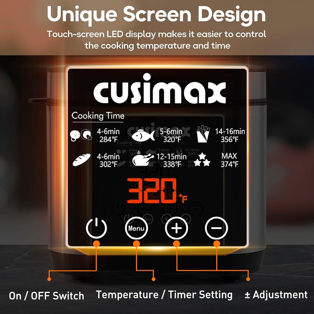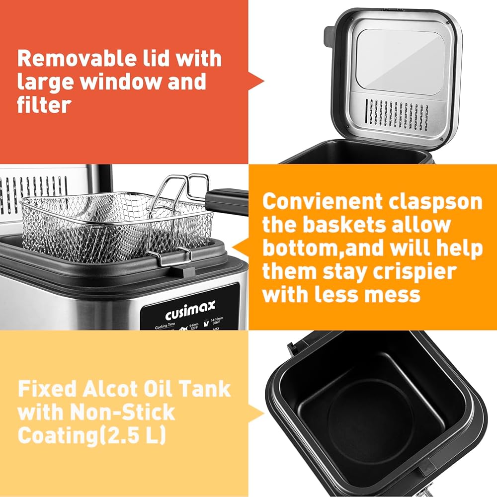 مريحة وآمنة: تم تصميم المقلاة العميقة الكهربائية CUSIMAX مع وضع الراحة في الاعتبار. يأتي الغطاء مع نافذة عرض، مما يسمح لك بمراقبة عملية طهي الطعام دون فتح الغطاء والتأثير على الحرارة الداخلية. وهذا يضمن أن طعامك يحتفظ بالمستوى المطلوب من القرمشة مع تقليل تناثر الزيت.