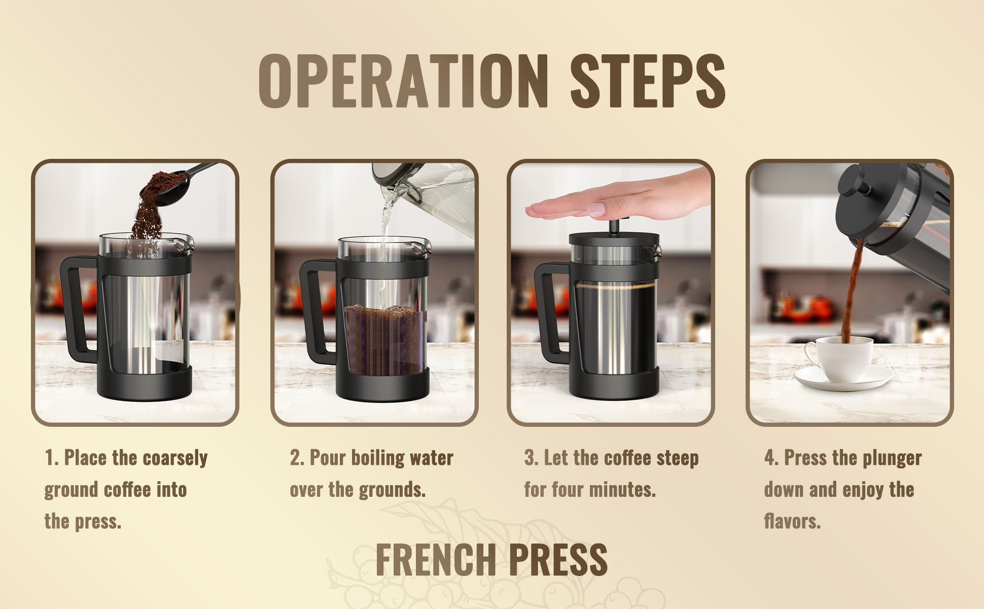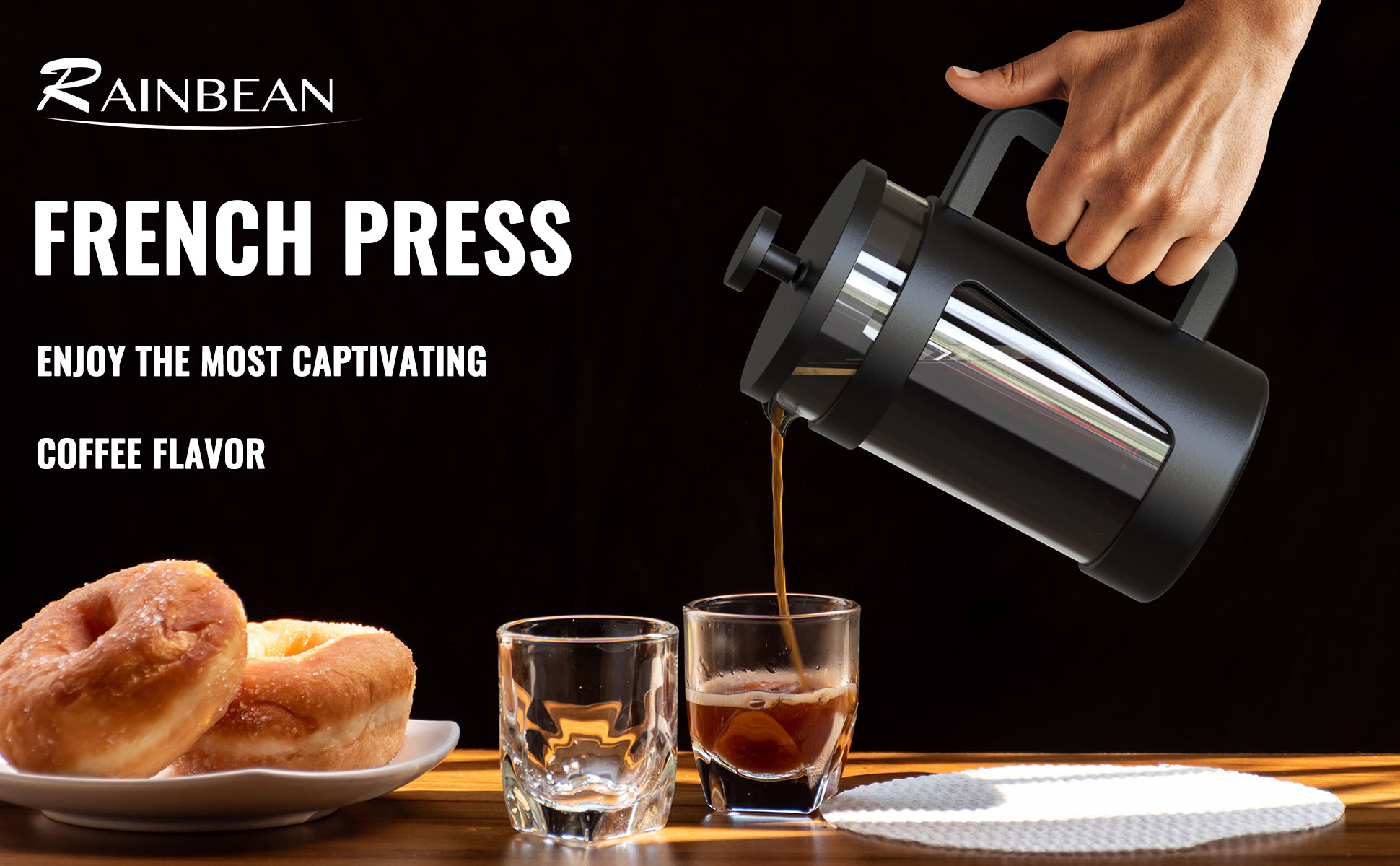 ماكينة الضغط الفرنسية: تقدم Rainbean ماكينة صنع القهوة الفرنسية بسعة 350 مل و600 مل. سعة 350 مل جيدة لكوب واحد للأفراد والأزواج، بينما يمكن للضغط الفرنسي سعة 600 مل توفير 2-4 أكواب، وهو خيار جيد لمحبي القهوة والمكاتب المنزلية والأنشطة الخارجية، مثل التخييم والتجمعات العائلية.