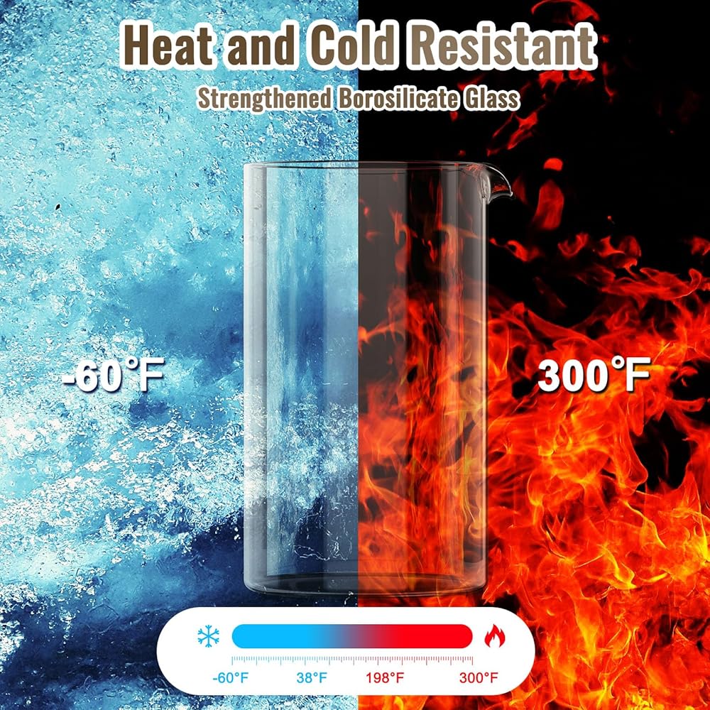 مواد متينة: مصنوعة من زجاج البوروسيليكات المقاوم للحرارة، والفولاذ المقاوم للصدأ 304 عالي الجودة، والبلاستيك، مما يضمن منع الصدأ والتآكل، ومضاد للتشوه، واستخدام طويل الأمد. والبلاستيك الخالي من مادة BPA الموجود على المقبض يمنع الحروق.