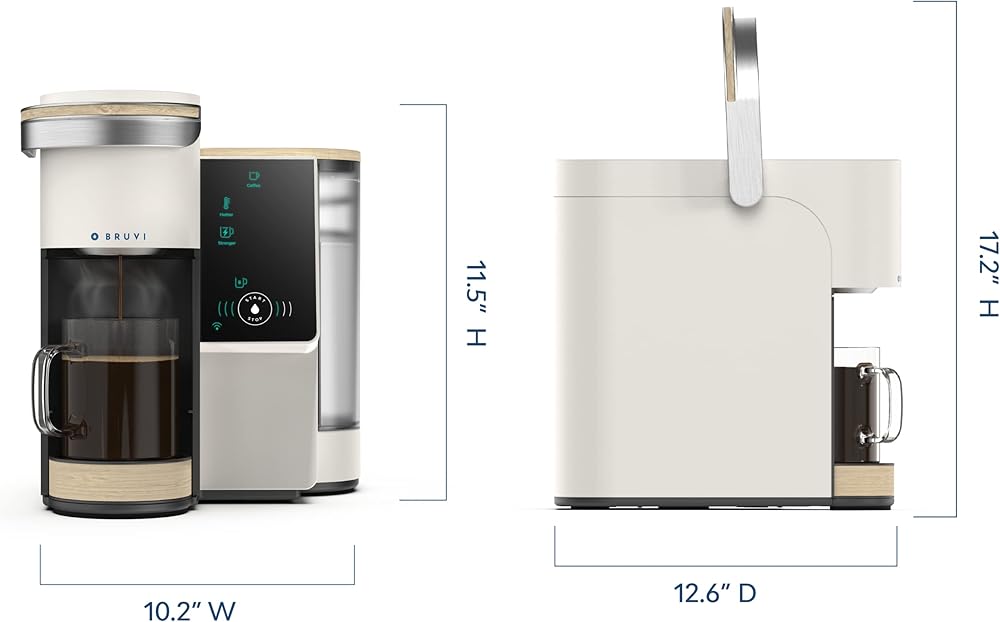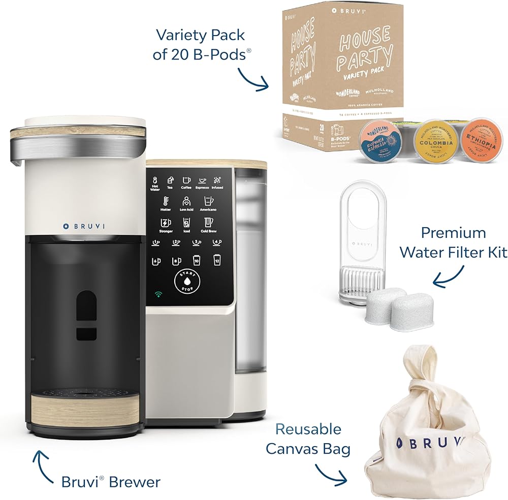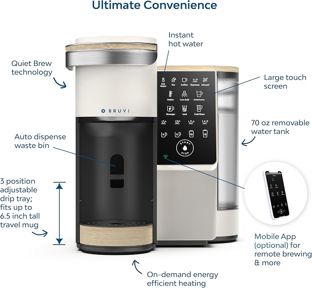 • ميزات الراحة: توفر Bruvi شاشة لمس كبيرة، وتشغيل حقيقي بلمسة واحدة، ومياه ساخنة نظيفة فورية، وتقنية تحضير هادئة، وخزان مياه قابل للإزالة بسعة 70 أونصة، وصينية تنقيط قابلة للتعديل، وصندوق نفايات توزيع تلقائي يحمل ما يصل إلى 6 علب B-Pods.