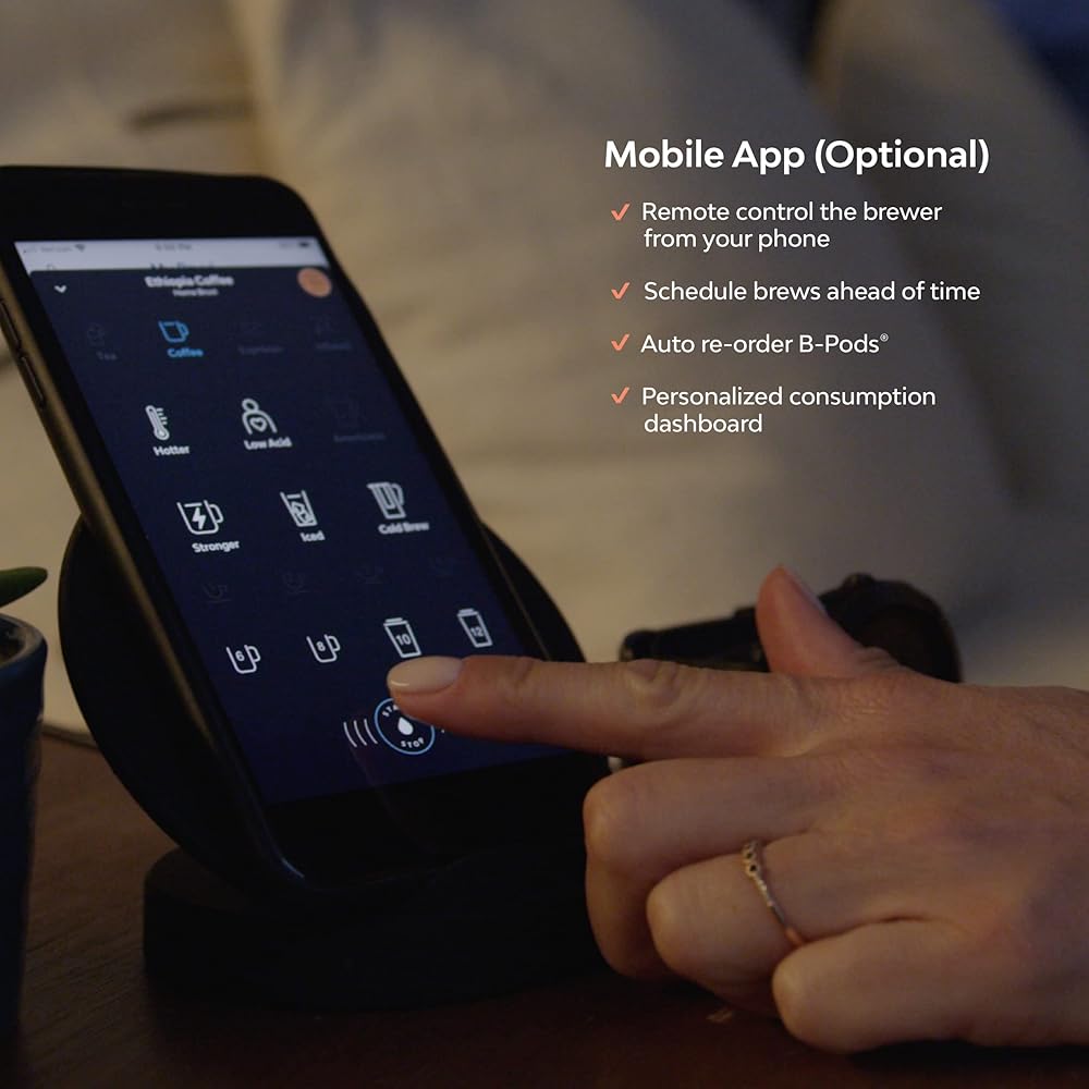 • تطبيق الهاتف المحمول: استخدم تطبيق Bruvi للتحضير عن بعد من هاتفك، وجدولة المشروبات مسبقًا، وإعادة طلب B-Pods تلقائيًا والوصول إلى لوحة معلومات الاستهلاك المخصصة. (التطبيق اختياري)