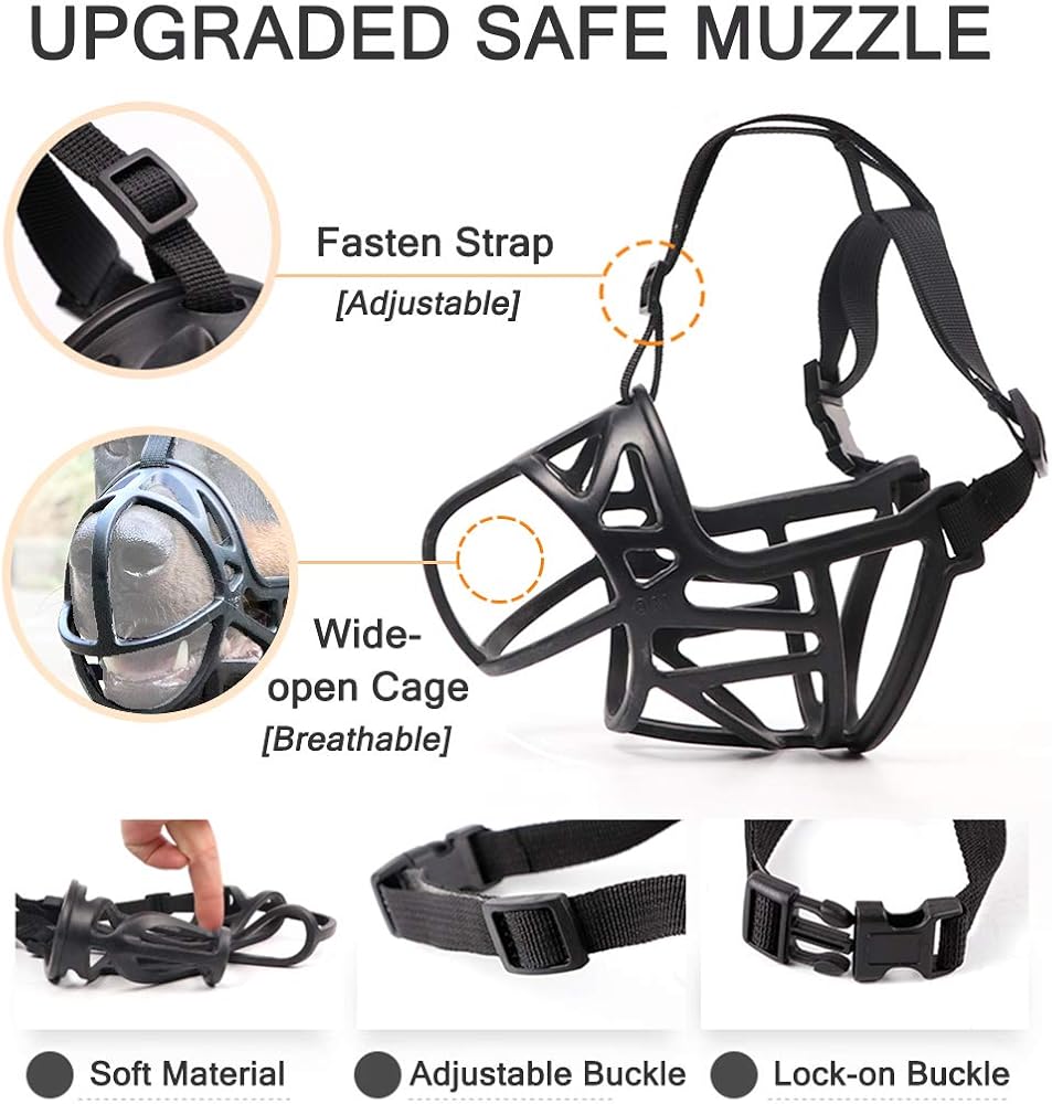ملاءمة آمنة وقابلة للتعديل: حزام رقبة قابل للتعديل وحزام فوق الرأس يسمح لك بضبط الكمامة لتناسب رأس كلبك بإحكام وأمان.