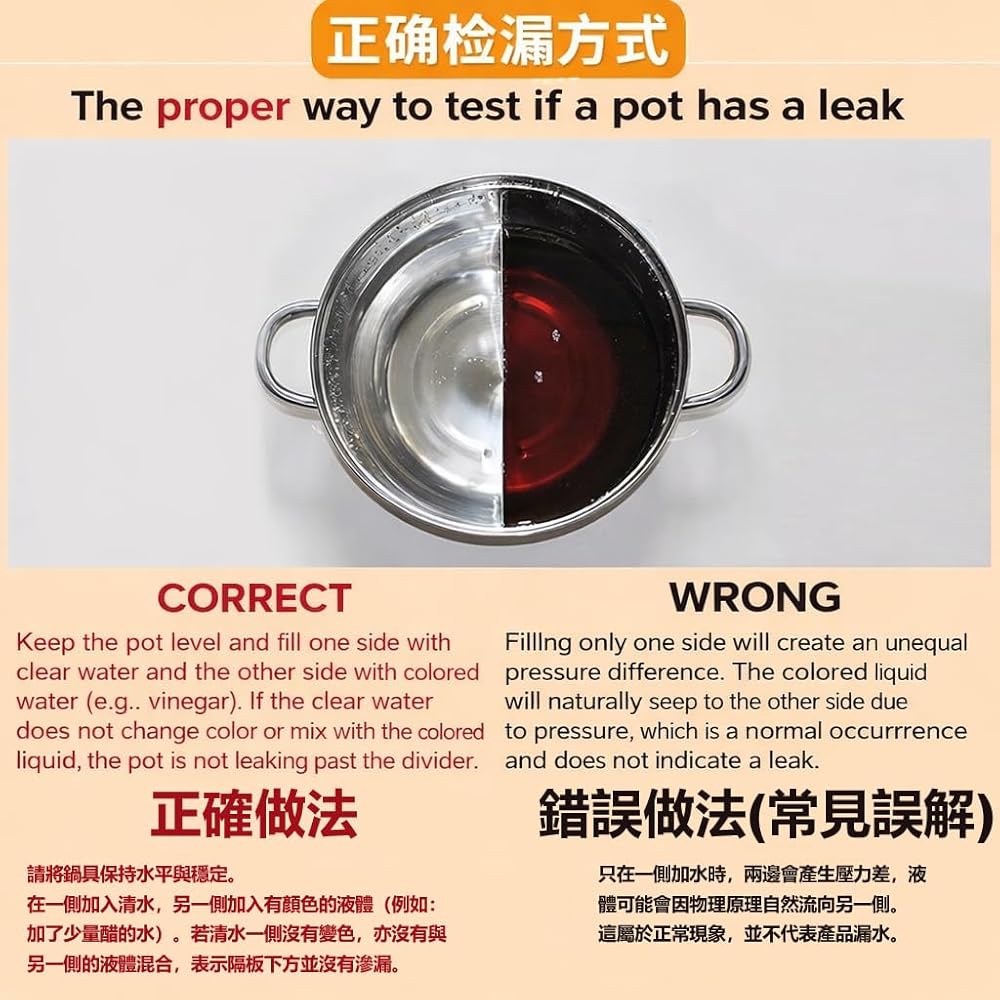 ***30-day money back guarantee***Talk to us before you return the item if have any questions.***Please make sure to put the stainless steel in the correct position.***Due to the spot welding technology of the divider, it stands the chance that very small spaces exist in between the divider sheet and the pot and liquid could seep into these spaces when the air/water pressure on one side is higher than the other side.***It is a normal phenomenon, and it will not affect the food's flavor as the seepage is almost gone when in use with the same amount of water on both sides.