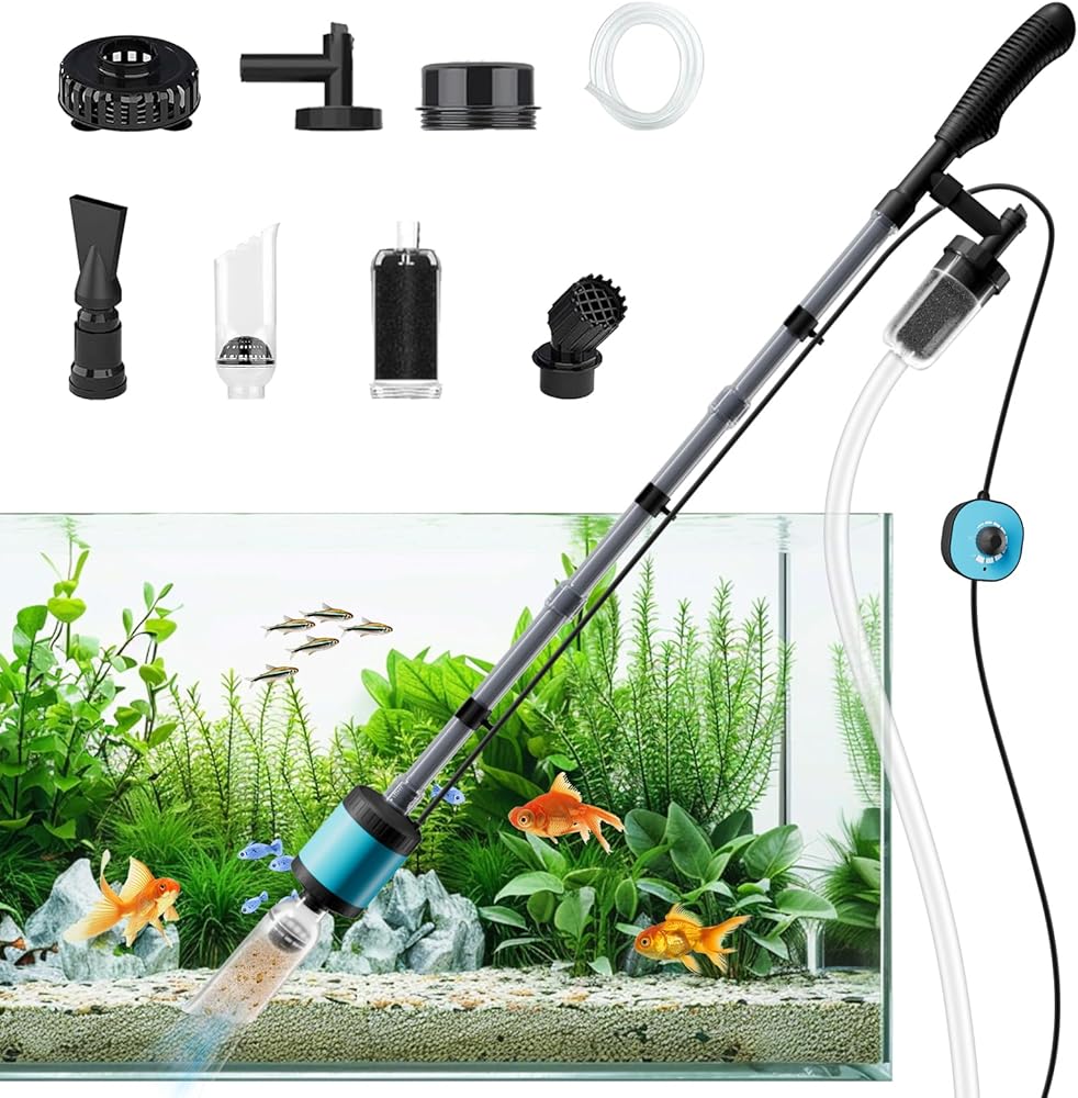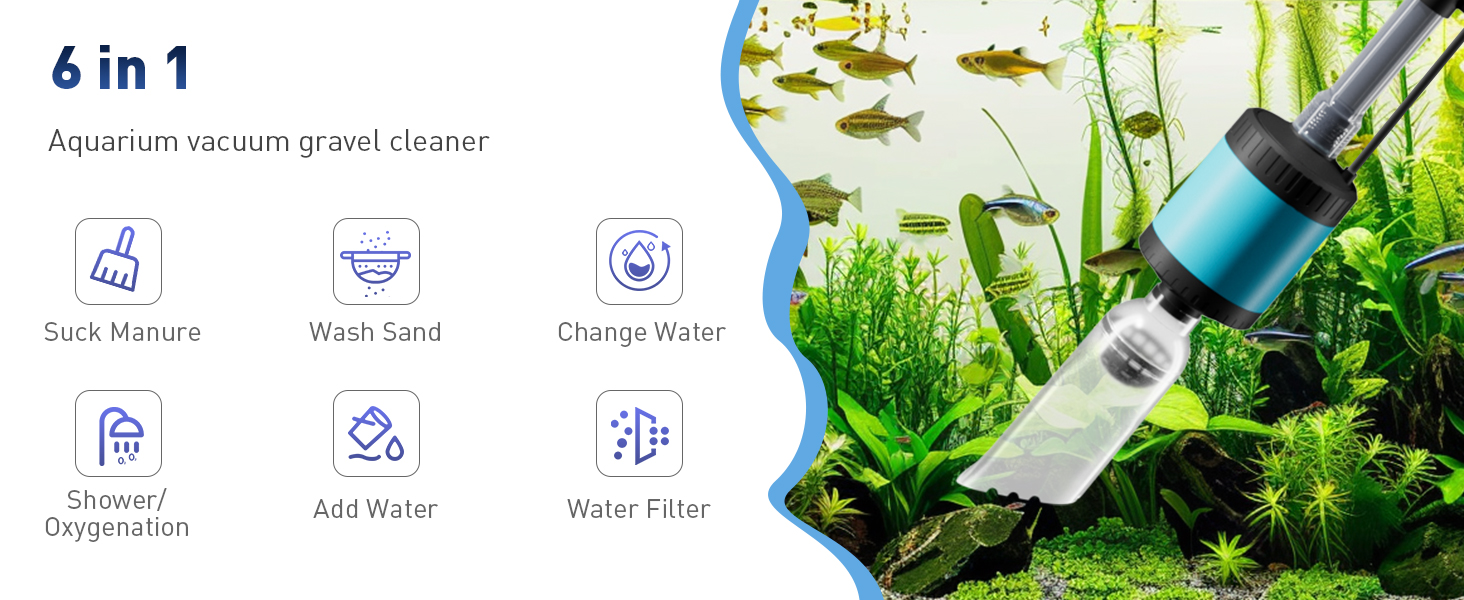 [مجموعة تنظيف خزان الأسماك 6 في 1 متعددة الاستخدامات] مجموعة تنظيف حوض السمك الشاملة لدينا هي الأداة المثالية لصيانة حوض السمك. مجهزة بأجزاء متعددة، فهي تتعامل ببراعة مع مجموعة من المهام بما في ذلك تغيير المياه، وتنظيف الرمل والحصى، وإزالة الحطام، والترشيح، وتدوير المياه، وحتى الاستحمام المنعش لحيواناتك الأليفة المائية. مجموعة فراغ حوض السمك الشاملة هذه تلغي الحاجة إلى أدوات متعددة ومنفصلة.