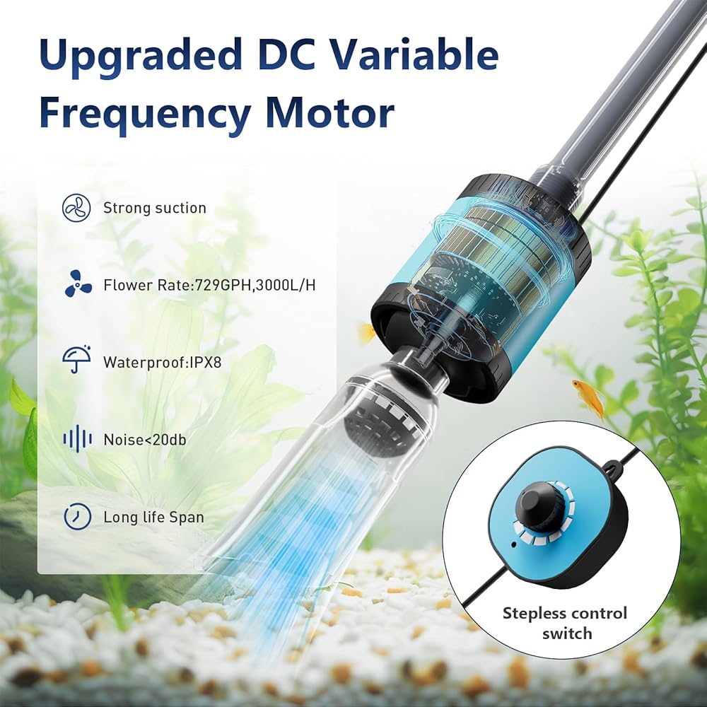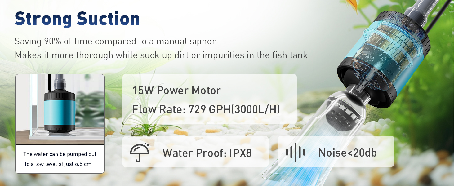 [مضخة تردد متغيرة قوية ولكن لطيفة] تم تصميم منظف خزان الأسماك المبتكر ذو الجهد المنخفض الخاص بنا لتكييف تدفق المياه مع الاحتياجات المحددة لحوض السمك الخاص بك وسكانه. يتميز منظف الحصى بمعدل تدفق أقصى يبلغ 729 جيجا في الساعة. مع القدرة على البدء والتوقف بهدوء، يقلل سيفون حوض السمك الأوتوماتيكي من إزعاج الحياة المائية والمعدات. يعمل التشغيل اللطيف أيضًا على تقليل التآكل الميكانيكي، مما يقلل من تكاليف الصيانة ويطيل عمر المضخة والمعدات ذات الصلة.