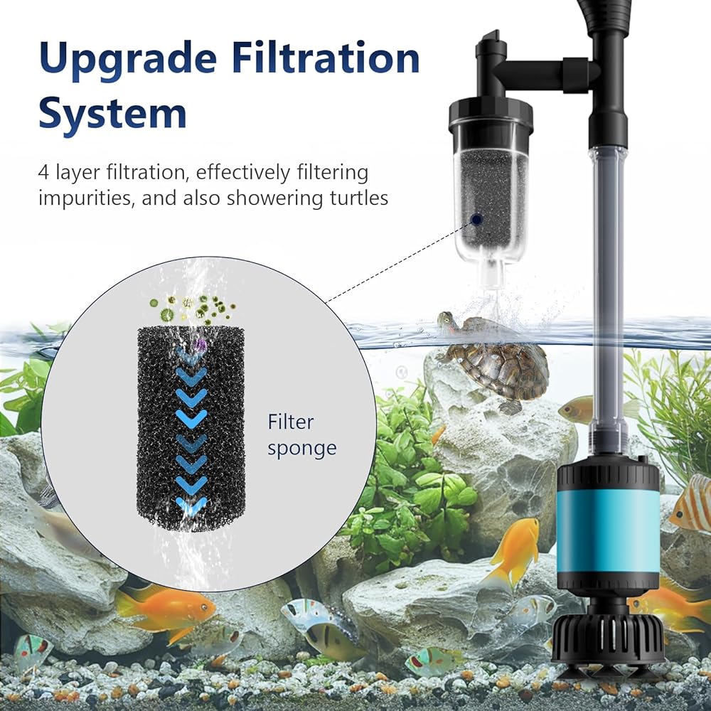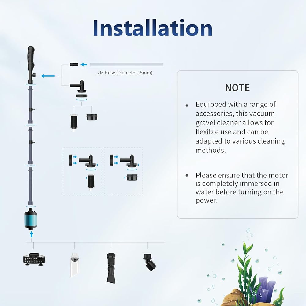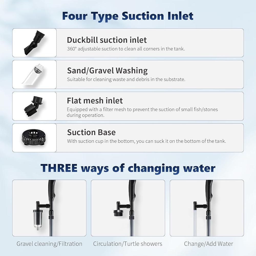 [قابل للتعديل لخزانات الأسماك/السلحفاة من 10 إلى 200 جالون] تم تصميم منظف الحصى الكهربائي الخاص بنا من أجل تعدد الاستخدامات، مع طول قابل للتعديل ليناسب أحواض السمك من 10 إلى 200 جالون عن طريق إضافة أو إزالة أنابيب التمديد الثلاثة. إنه الرفيق المثالي لتنظيف خزان الأسماك بشكل شامل. يرجى ملاحظة أن هذا المنتج غير مخصص للاستخدام في البركة الخارجية