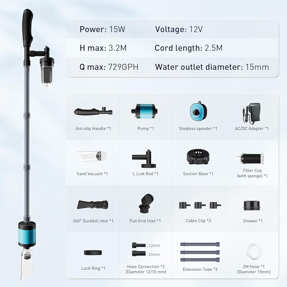 【أداة تفريغ فعالة وموفرة للوقت】 قم بتبسيط صيانة حوض السمك الخاص بك باستخدام منظف الحصى الكهربائي الخاص بنا، مقترنًا بخرطوم مياه قوي بطول 2 متر. قادر على تصريف 3000 لتر كل ساعة، ويتفوق على أدوات السيفون اليدوية في سهولة الاستخدام. تعمل المكنسة الكهربائية لدينا على تقليل وقت تغيير الماء بنسبة تزيد عن 70%، مما يعزز بشكل كبير كفاءة التنظيف ويجعل المهمة أكثر سهولة لأصحاب أحواض السمك.