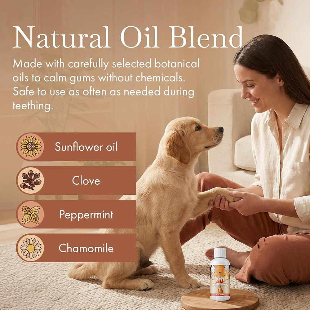 Our formula, which is made by infusing organically grown herbs into carrier oils such as sunflower oil, is the perfect natural teething remedy. We add a touch of essential oils (no more than a combined total of 0.83% per bottle) to help soothe and comfort your teething puppy.
