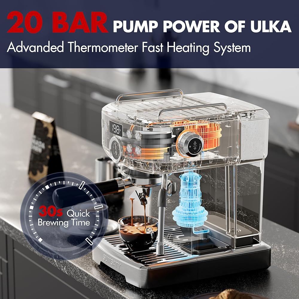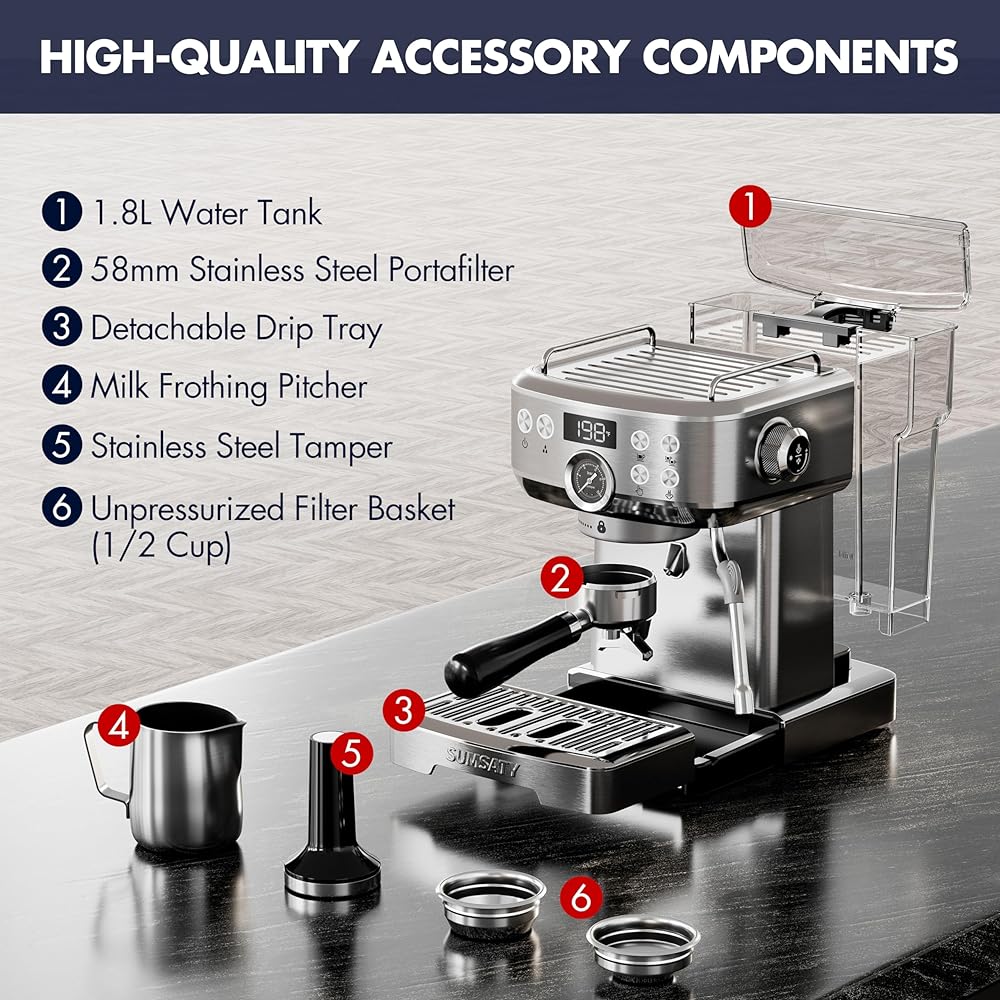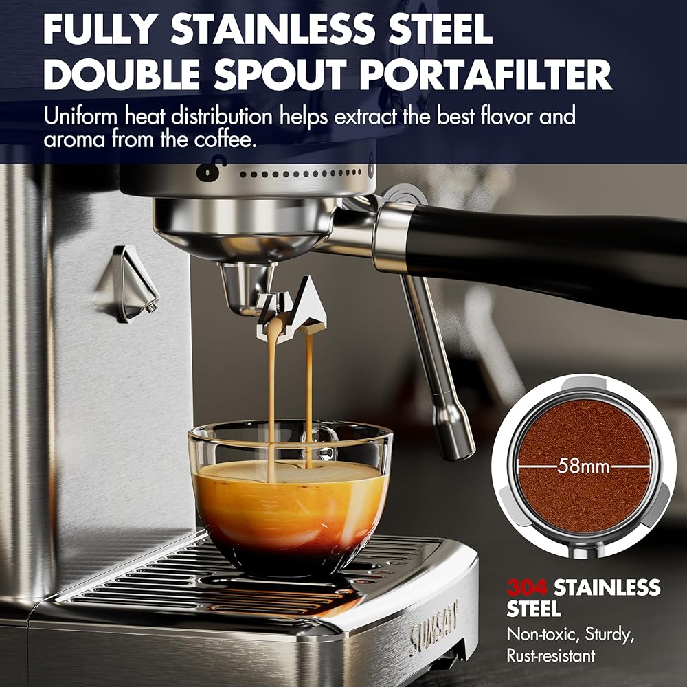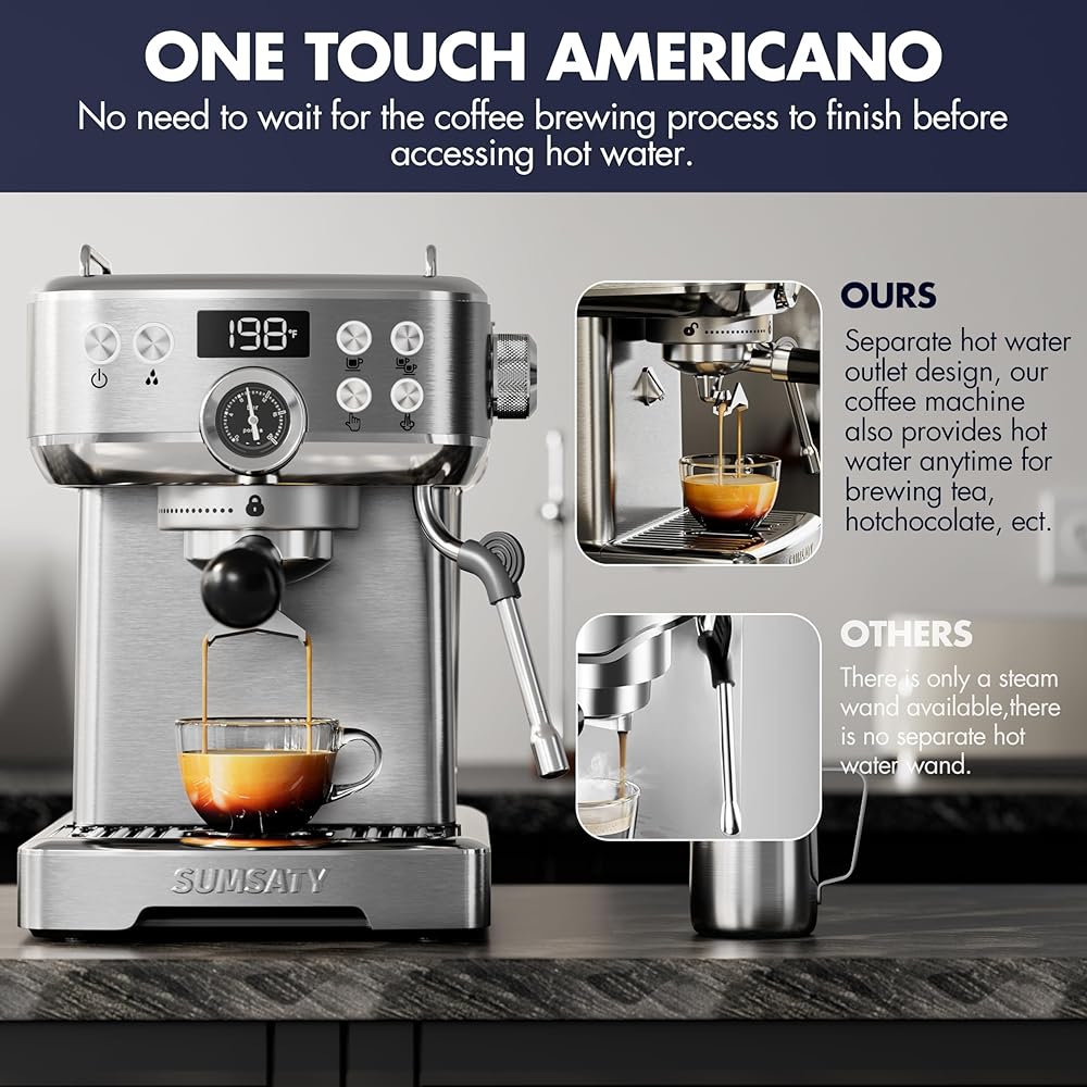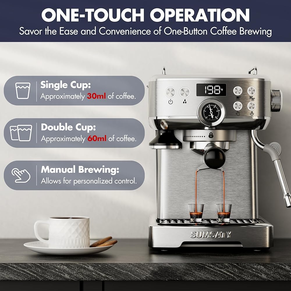 مضخة أولكا الاحترافية: ماكينة الإسبريسو سومساتي مجهزة بمضخة عالية الأداء بقوة 20 بار، جنبًا إلى جنب مع تقنية التسريب المسبق المتساوي والرطب، مما يضمن استخلاص كريمة القهوة بالكامل. مع وقت بدء سريع يبلغ 30 ثانية فقط ووقت استخلاص أقصى يصل إلى 60 ثانية، يمكنك الاستمتاع برائحة القهوة الغنية بسرعة ودون عناء.