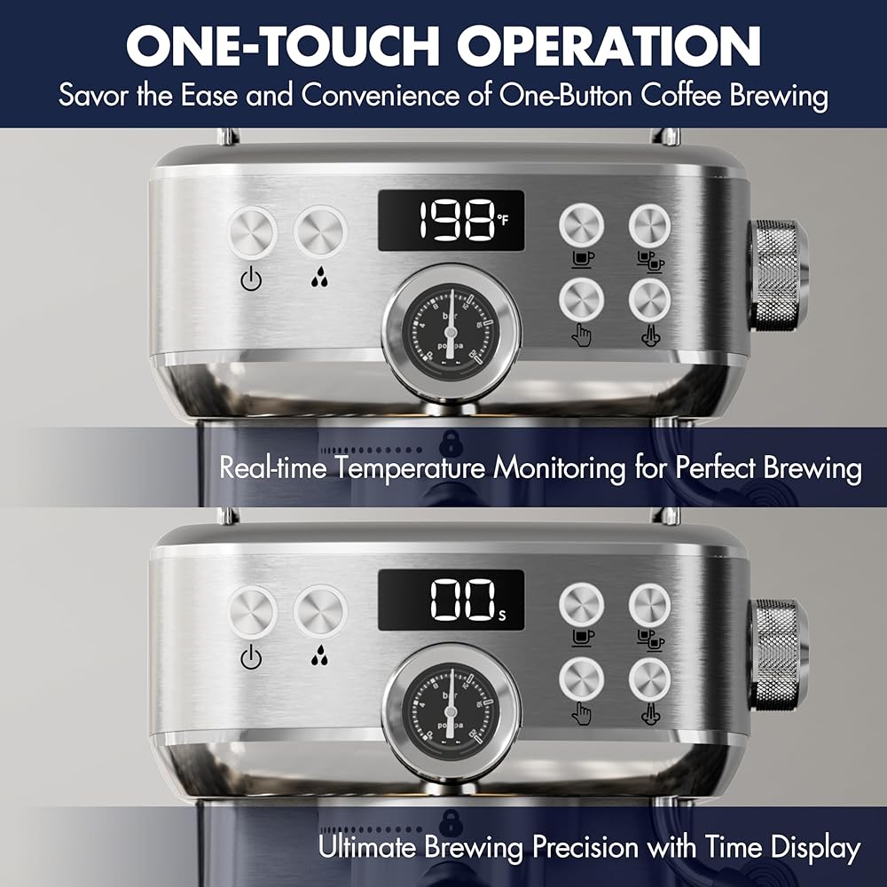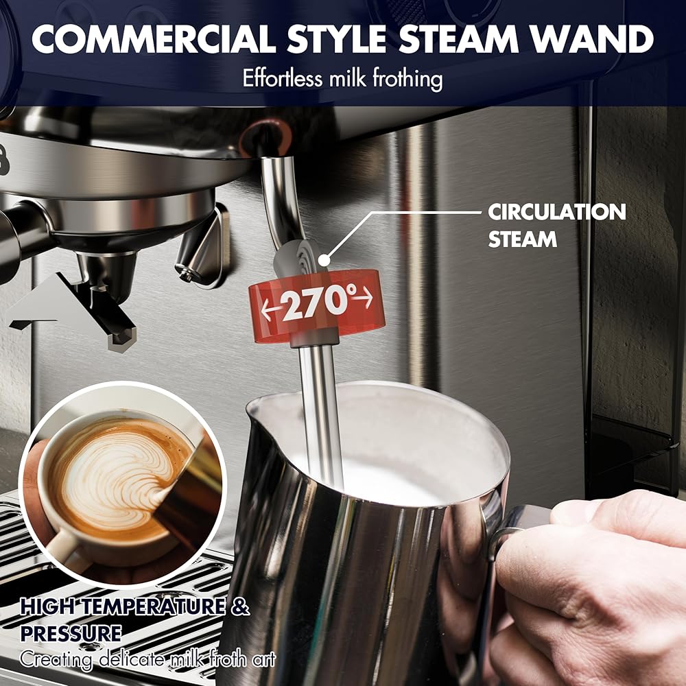 تصميم متعدد الوظائف: تتميز ماكينة الإسبريسو هذه بمفتاح سهل الاستخدام بلمسة واحدة، مما يوفر تجربة سلسة ومريحة. توفر خيارات متعددة لتخمير القهوة التلقائي واليدوي. بالإضافة إلى ذلك، فهي مجهزة بوظائف البخار والماء الساخن المنفصلة، مما يتيح لك تحضير مجموعة متنوعة من المشروبات اللذيذة دون عناء، بما في ذلك القهوة المنكهة واللاتيه والكابتشينو والأمريكانو.