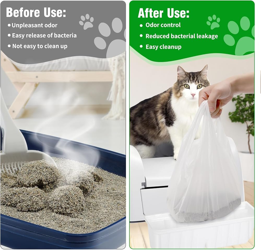 Easy to use: The connection between litter bags features a pre-cut opening that is easy to tear,simply place the litter bag in the litter box, fold over the edges, and when the bag is 2/3 full, just take out the bag, tie the handle tightly, and dispose of it!