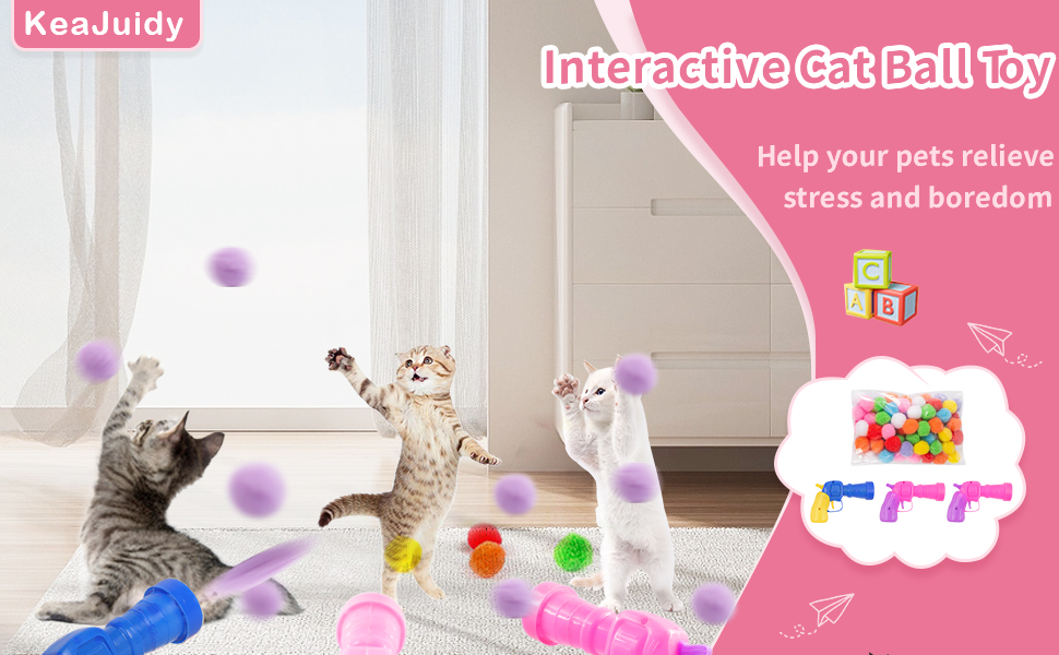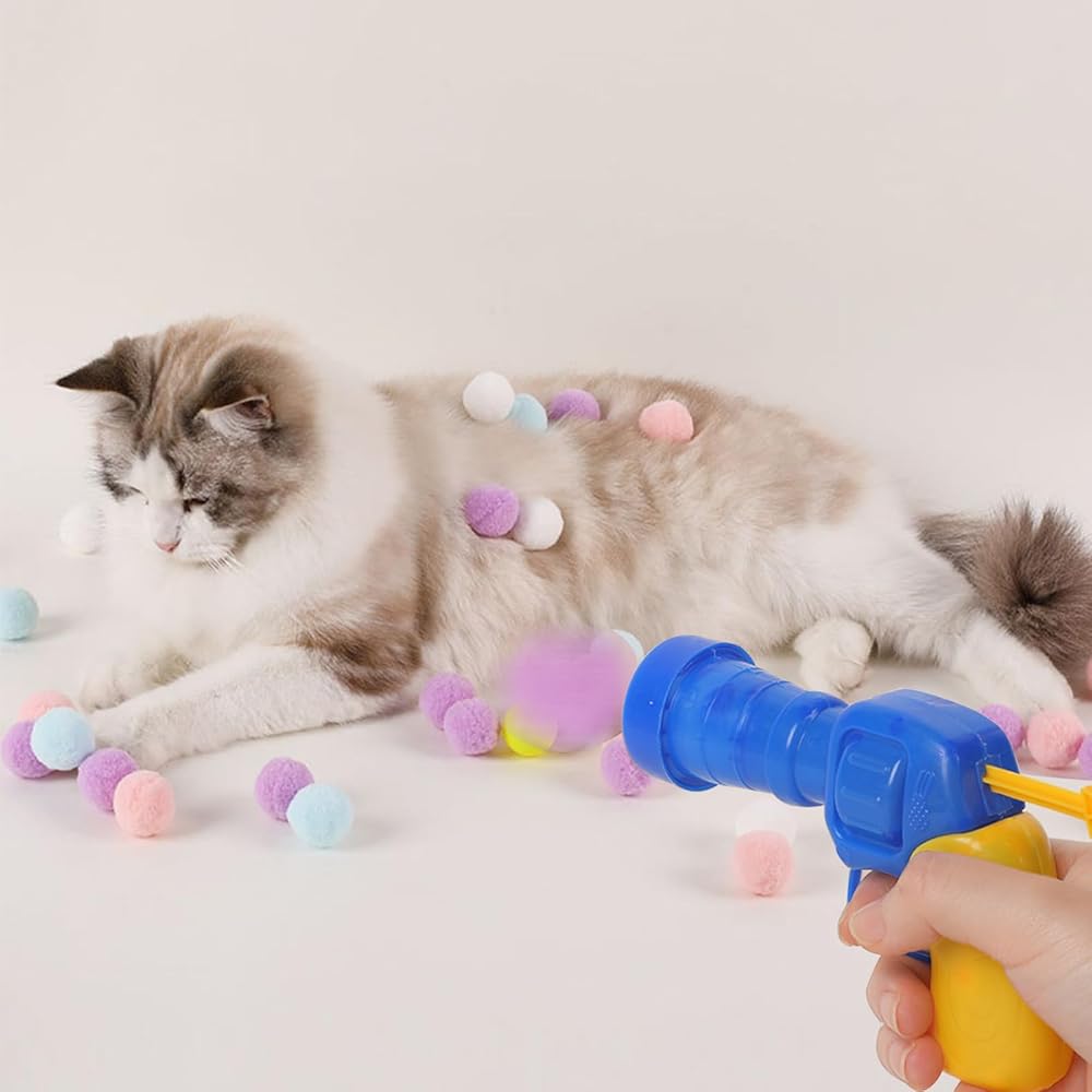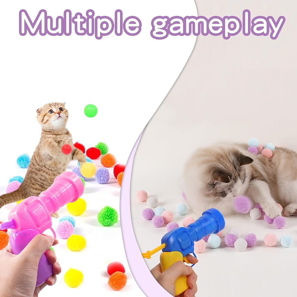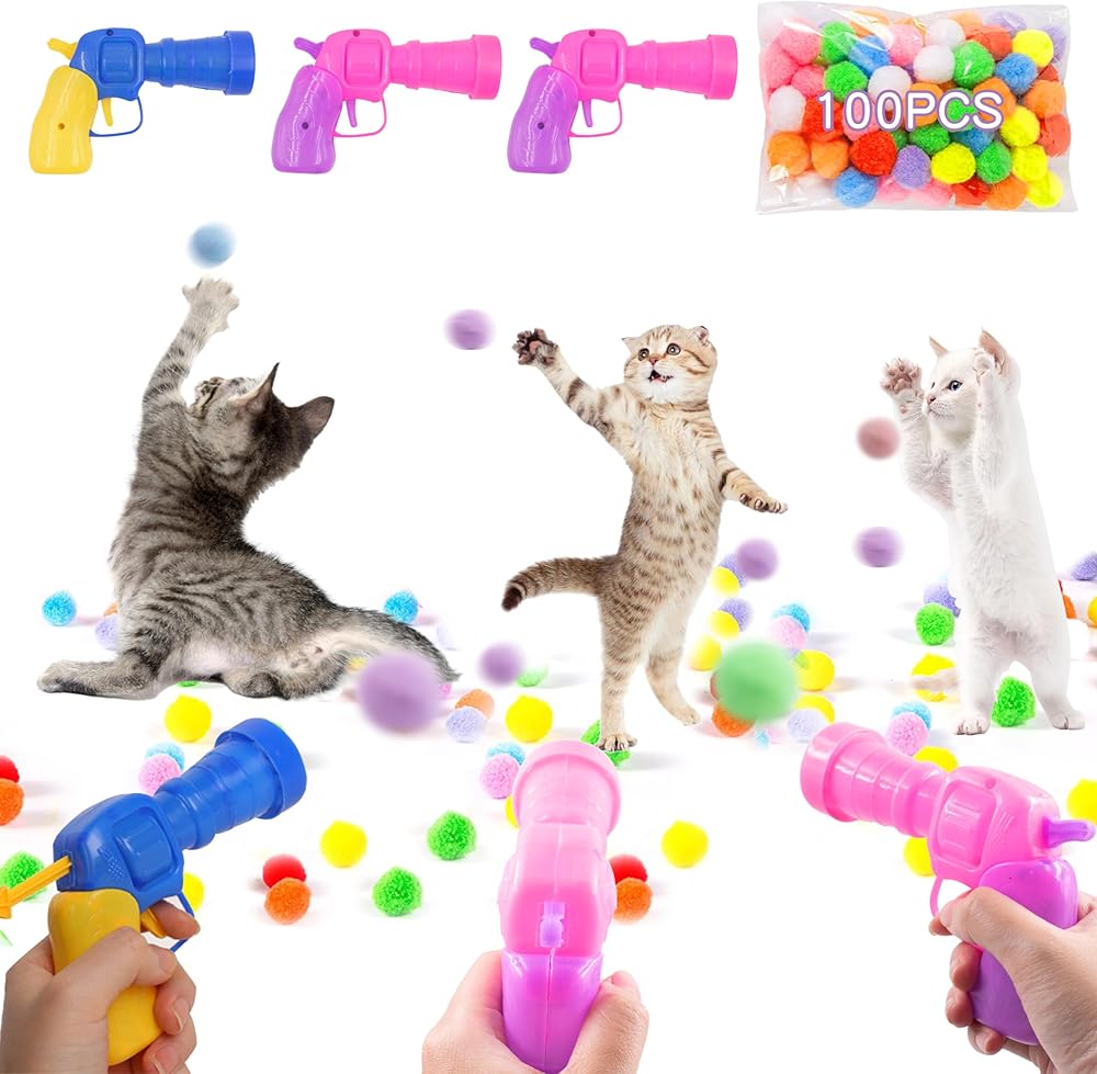 قاذفة كرات لعبة للقطط، 3 قطع قاذفة كرات للقطط مع 100 قطعة من كرات بوم بومس، كرات لعبة للقطط، ألعاب تفاعلية للقطط للقطط الصغيرة في الأماكن المغلقة، لعبة جلب القطط للتدريب على لعب المطاردة