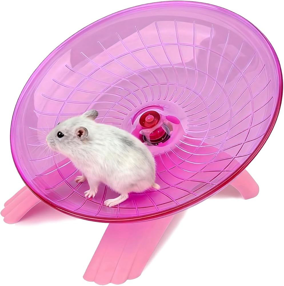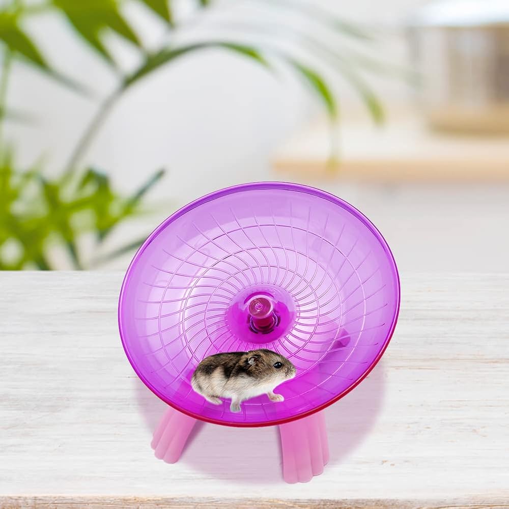 • 👍SILENT DESIGN: This hamster flying saucer wheel with ultra-quiet design, and smooth intimated edge of running wheels, it won't produce noise when played at night, you can sleep a few feet away from your hamster' s cage and you' ll not be disturbed by any noise.