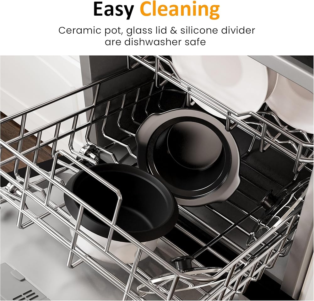 تنظيف سهل: الحفاظ على جهاز الطبخ المتعدد الخاص بنا أمر سهل للغاية، حيث أن جميع مكوناته بما في ذلك وعاء السيراميك، ووعاء الألومنيوم، والغطاء الزجاجي، ومغرفة الأرز، وكوب القياس، ومساند الغطاء آمنة للغسل في غسالة الأطباق، مما يضمن تنظيفًا خاليًا من المتاعب.