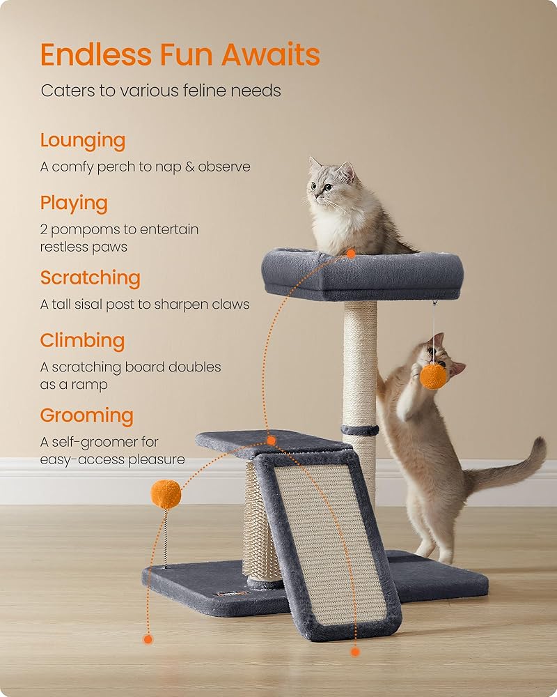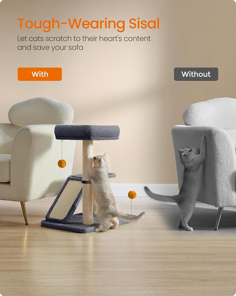 عمود خدش للقطط من Feandrea مع سرير، أداة خدش للقطط متعددة الوظائف مع مجثم، منحدر قابل للدوران، أداة العناية الذاتية، الكريات، شجرة قطط صغيرة للقطط الداخلية، رمادي داكن UPCA024G02