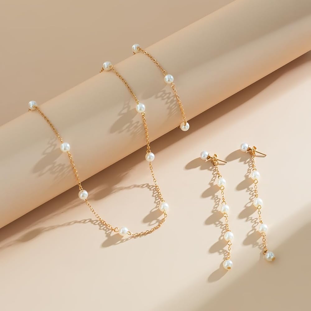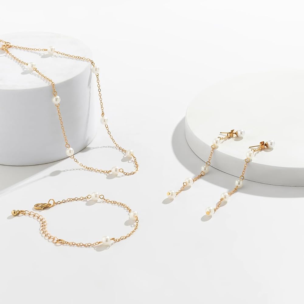 Pearl Necklace and Earring Set Dainty Prom Pearl Necklaces Pearl Earrings Dangling Pearl Bracelet for Women Tiny Pearl Jewelry Set Gift for Wedding Bridal Bridesmaid