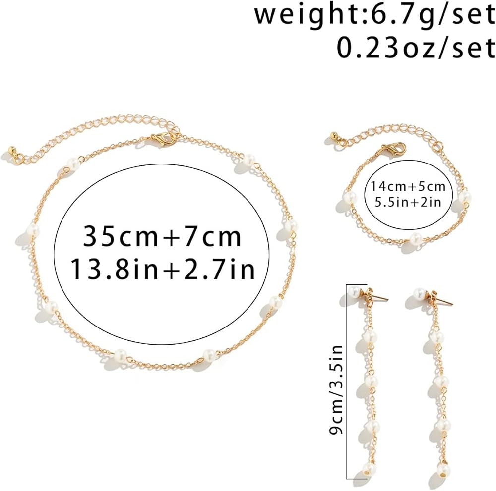 Pearl Earrings for Women: These Gold Pearl Choker Necklaces kit sizes: a 13.8-inch necklace with a 2.7-inch extension chain; The bracelet is 5.5 inches long with a 2inch extension chain; The earring is 3.5 inches long.