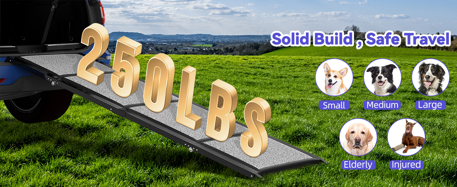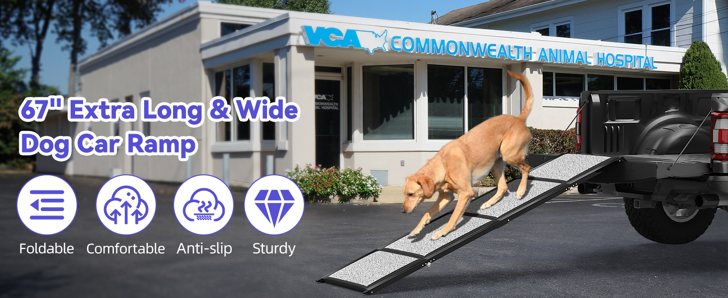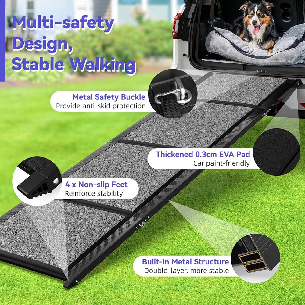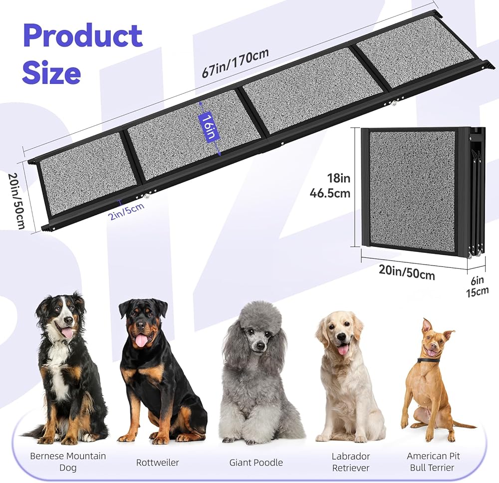 منحدر للكلاب في السيارة، بطول 67 بوصة وعرض 50.8 سم - منحدر محمول للحيوانات الأليفة واسع للغاية للكلاب المتوسطة والكبيرة مع سطح سجادة غير قابل للانزلاق، يصل إلى 250 رطل، منحدر سيارة للكلاب لسيارة الدفع الرباعي/الشاحنة/سرير مرتفع، خطوات الكلب في الهواء الطل