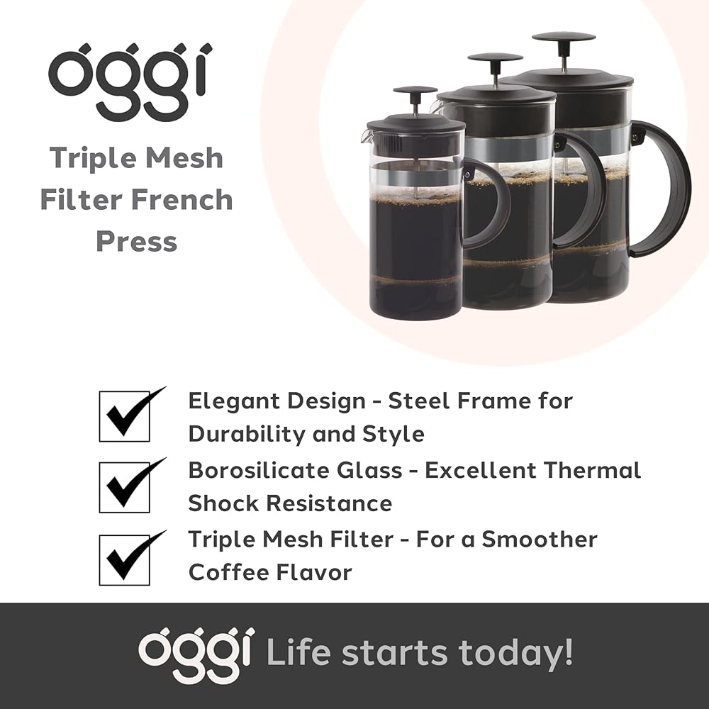 Fuel the barista in you! Enjoy the great flavor and ease of use that comes from making coffee at home with OGGI's Triple Mesh Filter Borosilicate Glass French Press Coffee Maker. The durable borosilicate glass canister sits securely in a stainless steel frame giving this French Press an elegant everyday style. Borosilicate glass is thermal shock resistant, which allows it to endure extreme temperate changes without breaking. Steep the perfect cup of coffee every time by controlling the temperate and extraction. Making coffee with our French Press coffee is so fresh and flavorful it feels like a luxury! When it is time to pour, the built-in triple mesh filter reduces ground coffee sediment. The filter also allows loose tea leaves to be brewed in the French Press. Serve straight from the 3 cup / 350 ml (12 fl oz) coffee maker and enjoy easy handling with its cool-to-the-touch contemporary styled body, handle, and lid. If you put this product in the dishwasher to clean it is recommended that it is placed on the top rack to ensure quality.