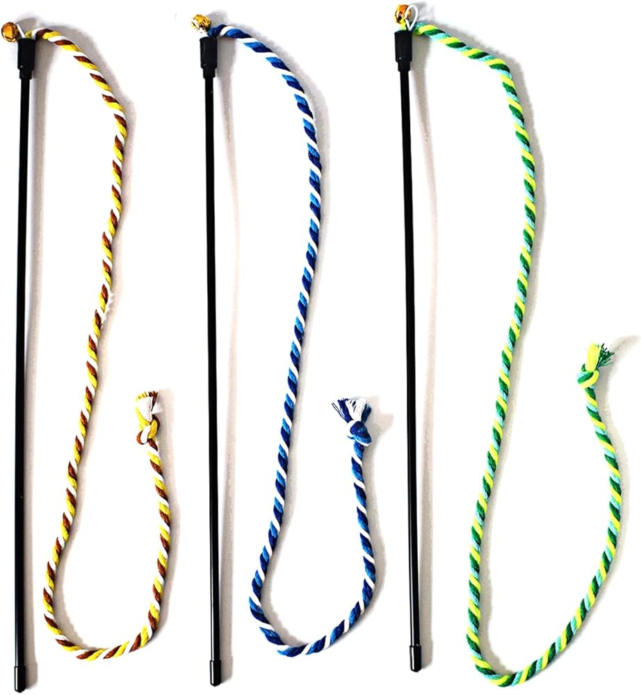 Cat wands Package include 3 pcs cat wands. The length of rod is 16.5''/42 cm and the head of cat wand is 23.6''/60 cm which is long enough to play with cats at a safe distance Premium Quality Material:The cat ribbon wand toys for indoor cats are made of soft,colorful twine fabric and high-elastic wand, safe, durable Lightweight Little Bell - There's a little bell tied to the top of the pole that jingles when you wave it to get the cat's attention. If you don't need it, you can just snip it off Design for cats - These cat wands are all handcrafted from safe materials for pet playing and chewing.Polychromatic hues have a propensity to capture the feline's focus Interactive Cat Toys - Cats and kittens are crazy about chaser games! You can wave the cat wand to help your indoor cats to flip, jump, pounce, chase and be a happy pet! Cat toys for indoor cats and kittens of all ages